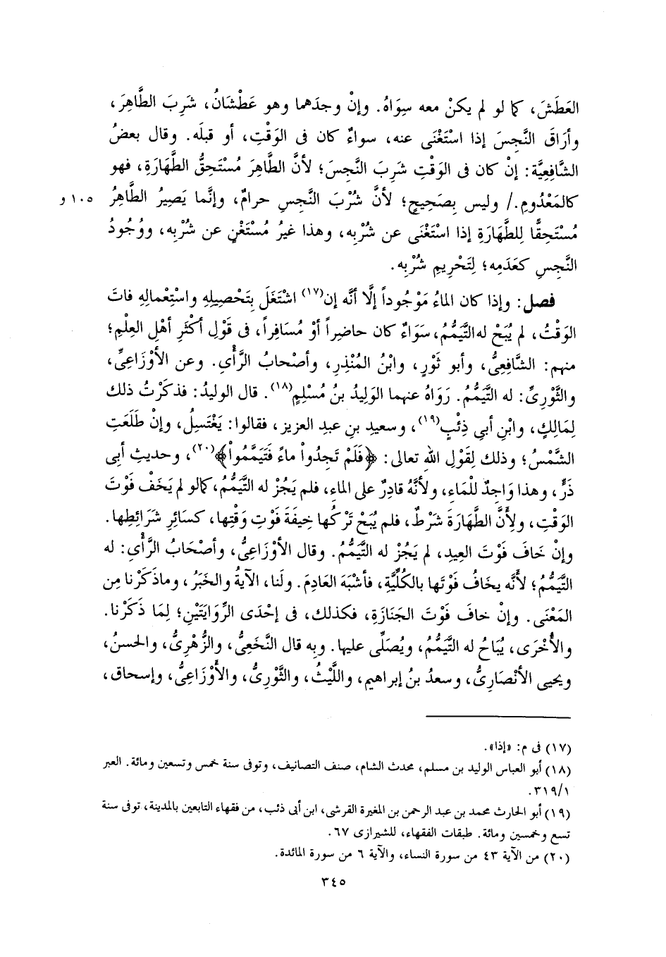 فصل: وإذا كان الماءُ مَوْجُودًا إلَّا أنَّه إن (١٧) اشْتَغَلَ بِتَحْصِيلِهِ واسْتِعْمالِهِ فاتَ الوَقْتُ، لم يُبَحْ له التَّيَمُّمُ، سَوَاءٌ كان حاضِرًا أوْ مُسَافِرًا، في قَوْلِ أكْثَرِ أهْلِ العِلْمِ؛ منهم: الشَّافِعِىُّ، وأبو ثَوْرٍ، وابْنُ المُنْذِرِ، وأصْحابُ الرَّأْىِ. وعن الأوْزاعِىِّ، والثَّوْرِىِّ: له التَّيَمُّمُ. رَوَاهُ عنهما الوَلِيدُ بنُ مُسْلِمٍ (١٨). قال الوليدُ: فذكَرْتُ ذلك لِمَالِكٍ، وابْنِ أبِى ذِئْبٍ (١٩)، وسعيدِ بنِ عبدِ العزيز، فقالوا: يَغْتَسِلُ، وإنْ طَلَعَتِ الشَّمْسُ؛ وذلك لِقَوْلِ اللهِ تعالى: {فَلَمْ تَجِدُوا مَاءً فَتَيَمَّمُوا} (٢٠)، وحديثِ أبِى ذَرٍّ، وهذا وَاجدٌ للْمَاءِ، ولأنَّهُ قادِرٌ على الماءِ، فلم يَجُزْ له التَّيَمُّمُ، كما لو لم يَخَفْ فَوْتَ الوَقْتِ، ولِأَنَّ الطَّهَارَةَ شَرْطٌ، فلم يُبَحْ تَرْكُها خِيفَةَ فَوْتِ وَقْتِها، كسَائِرِ شَرَائِطِها. وإنْ خَافَ فَوْتَ العِيدِ، لم يَجُزْ له التَّيَمُّمُ. وقال الأوْزَاعِىُّ، وأصْحَابُ الرَّأْىِ: له التَّيَمُّمُ؛ لأَنَّه يخَافُ فَوْتَها بالكُلِّيَّةِ، فأشْبَهَ العَادِمَ. ولَنا، الآيةُ والخَبَرُ، وما ذَكَرْنا مِن المَعْنَى. وإنْ خافَ فَوْتَ الجَنَازَةِ، فكذلك، في إحْدَى الرِّوَايَتَيْنِ؛ لِمَا ذَكَرْنا. والأُخْرَى، يُبَاحُ له التَّيَمُّمُ، ويُصَلِّى عليها. وبِه قال النَّخَعِىُّ، والزُّهْرِىُّ، والحسنُ، ويحيى الأنْصَارِىُّ، وسعدُ بنُ إبراهيم، واللَّيْثُ، والثَّوْرِىُّ، والأَوْزَاعِىُّ، وإسحاق،
