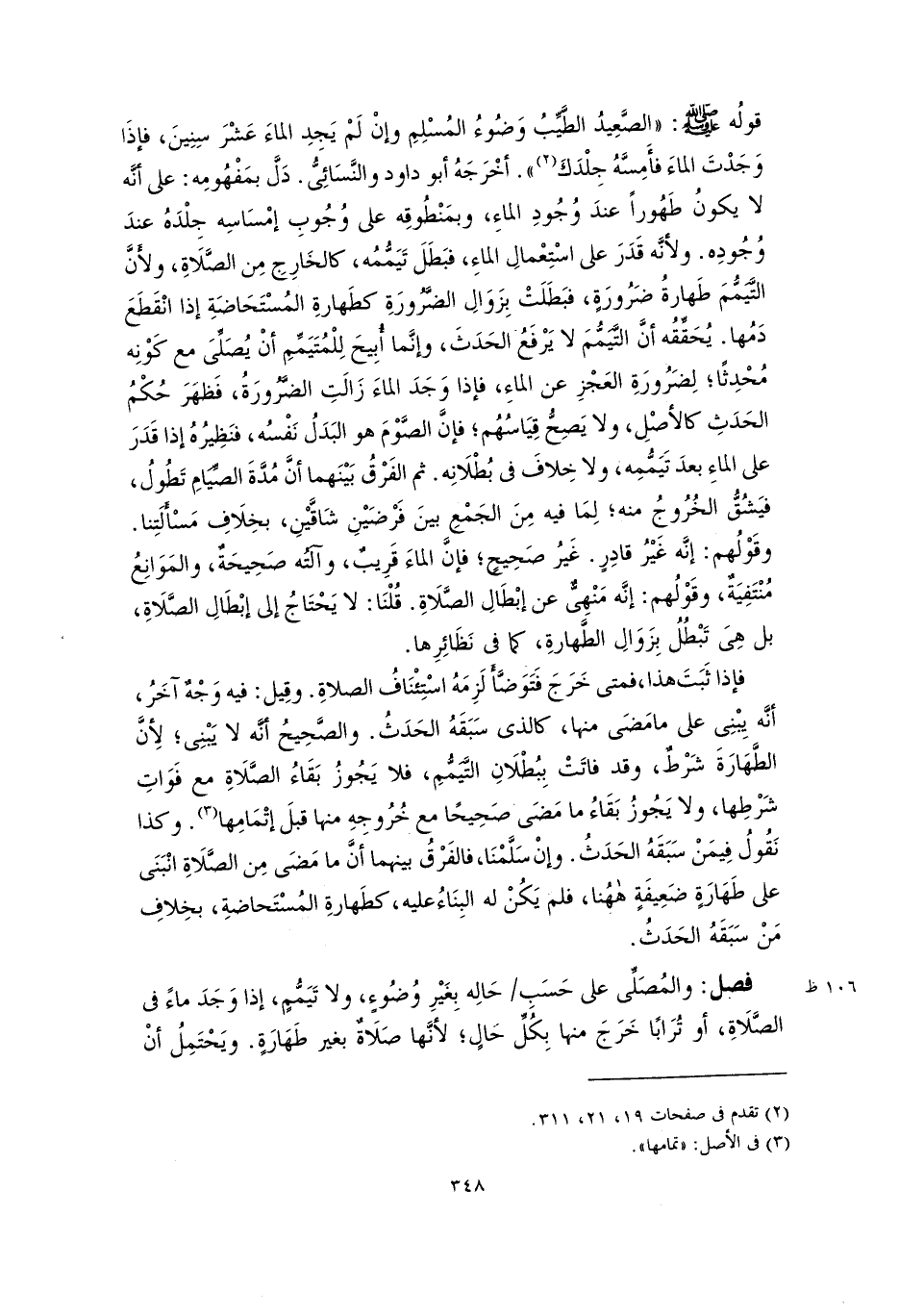 قولُه -صلى اللَّه عليه وسلم-: "الصَّعِيدُ الطَّيِّبُ وَضُوءُ المُسْلِمِ وإنْ لَمْ يَجِدِ الماءَ عَشْرَ سِنِينَ، فإذَا وَجَدْتَ الماءَ فأَمِسَّهُ جِلْدَكَ (٢) ". أخْرَجَهُ أبو داود والنَّسَائِىُّ. دَلَّ بمَفْهُومِه: على أنَّه لا يكونُ طَهُورًا عندَ وُجُودِ الماءِ، وبمَنْطُوقِه على وُجُوبِ إمْسَاسِه جِلْدَهُ عندَ وُجُودِه. ولأنَّه قَدَرَ على اسْتِعْمالِ الماءِ، فبَطَلَ تَيَمُّمُه، كالخَارِجِ مِن الصَّلَاةِ، ولأنَّ التَّيَمُّمَ طَهارةُ ضَرُورَةٍ، فبَطَلَتْ بِزَوَالِ الضَّرُورَةِ كطهارةِ المُسْتَحَاضَةِ إذا انْقَطَعَ دَمُها. يُحَقِّقُه أنَّ التَّيَمُّمَ لا يَرْفَعُ الحَدَثَ، وإنَّما أُبِيحَ لِلْمُتَيَمِّمِ أنْ يُصَلِّىَ مع كَوْنِه مُحْدِثًا؛ لِضَرُورَةِ العَجْزِ عن الماءِ، فإذا وَجَدَ الماءَ زَالَتِ الضَّرُورَةُ، فَظهَرَ حُكْمُ الحَدَثِ كالأصْلِ، ولا يَصِحُّ قِيَاسُهُم؛ فإنَّ الصَّوْمَ هو البَدَلُ نَفْسُه، فنَظِيرُهُ إذا قَدَرَ على الماءِ بعدَ تَيَمُّمِه، ولا خِلافَ في بُطْلَانِه. ثم الفَرْقُ بَيْنَهما أنَّ مُدَّةَ الصِّيَامِ تَطُولُ، فيَشُقُّ الخُرُوجُ منه؛ لِمَا فيه مِنَ الجَمْعِ بينَ فَرْضَيْنِ شَاقَّيْنِ، بخِلَافِ مَسْأَلَتِنا. وقَوْلُهم: إنَّه غيْرُ قادِرٍ. غَيرُ صَحِيحٍ؛ فإنَّ الماءَ قَريبٌ، وآلَتُه صَحِيحَةٌ، والمَوَانِعُ مُنْتَفِيَةٌ، وقَوْلُهم: إنَّه مَنْهِىٌّ عن إبْطَالِ الصَّلَاةِ. قُلْنَا: لا يَحْتَاجُ إلى إبْطَالِ الصَّلَاةِ، بل هِىَ تَبْطُلُ بِزَوَالِ الطَّهارةِ، كما في نَظَائِرِها.