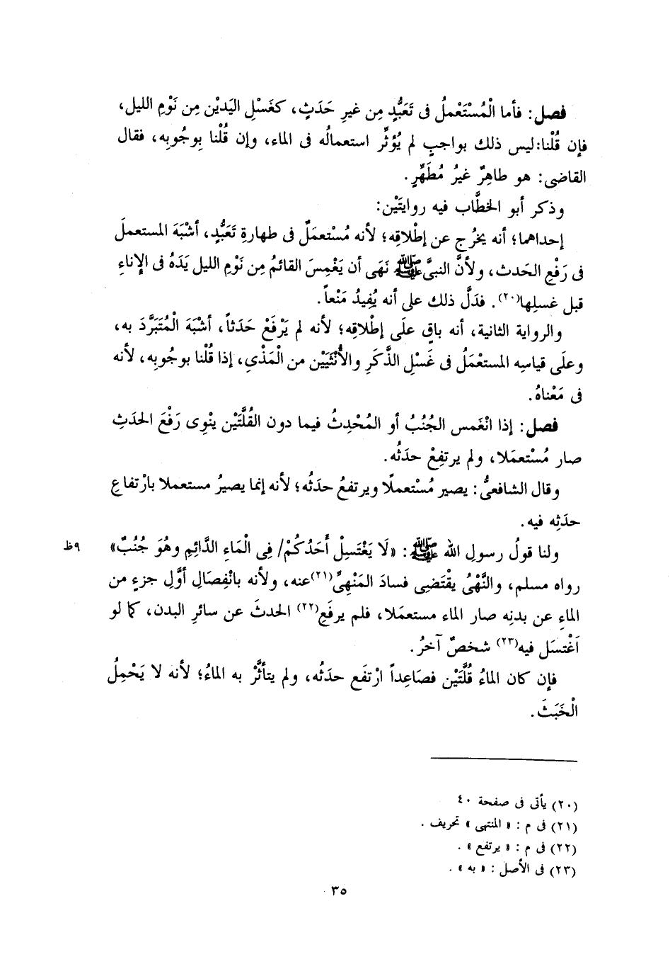 إحداهما؛ أنه يخرُج عن إطْلاقِه؛ لأنه مُسْتعمَلٌ في طهارةِ تَعَبُّدٍ، أشْبَهَ المستعملَ في رَفْعِ الحَدث، ولأنَّ النبيَّ -صلى اللَّه عليه وسلم- نَهَى أن يَغْمِسَ القائمُ مِن نَوْمِ الليل يَدَهُ في الإِناءِ قبل غسلِها (٢٠). فدَلَّ ذلك على أنه يُفِيدُ مَنْعًا.