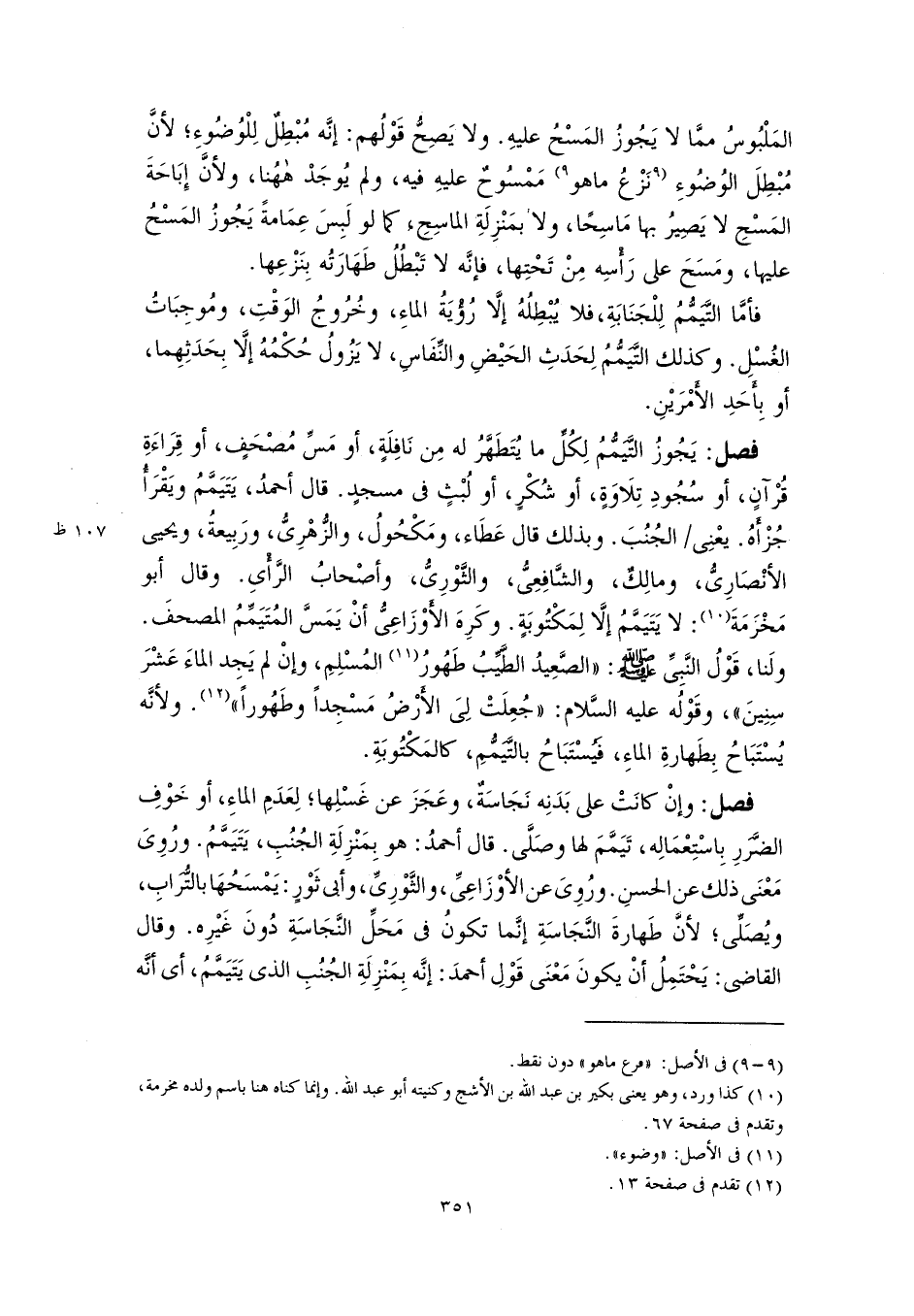 فصل: يَجُوزُ التَّيَمُّمُ لِكُلِّ ما يُتَطَهَّرُ له مِن نَافِلَةٍ، أو مَسِّ مُصْحَفٍ، أو قِرَاءَةِ قُرْآنٍ، أو سُجُودِ تِلَاوَةٍ، أو شُكْرٍ، أو لُبْثٍ في مسجدٍ. قال أحمدُ، يَتَيَمَّمُ ويَقْرَأُ جُزْأَهُ. يعْنِي الجُنُبَ. وبذلك قال عَطَاء، ومَكْحُولُ، والزُّهْرِيُّ، ورَبِيعةُ، ويحيى الأنْصَارِيُّ، ومالِكٌ، والشَّافِعِيُّ، والثَّوْرِيُّ، وأصْحابُ الرَّأْيِ. وقال أبو مَخْرَمَةَ (١٠): لا يَتَمَّمُ إلَّا لِمَكْتُوبَةٍ. وكَرِهَ الأَوْزَاعِيُّ أنْ يَمَسَّ المُتَيَمِّمُ المصحفَ. ولَنا، قَوْلُ النَّبِيِّ -صلى اللَّه عليه وسلم-: "الصَّعِيدُ الطَّيِّبُ طَهُورُ (١١) المُسْلِمِ، وإنْ لم يَجِد الماءَ عَشْرَ سِنِينَ"، وقَوْلُه عليه السَّلام: "جُعِلَتْ لِىَ الأَرْضُ مَسْجِدًا وطَهُورًا" (١٢). ولأنَّه يُسْتَبَاحُ بِطَهارةِ الماءِ، فَيُسْتَبَاحُ بالتَّيَمُّمِ، كالمَكْتُوبَةِ.