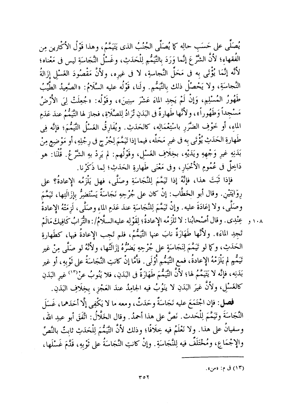 فإذا ثَبَتَ هذا، فإنَّهُ إذا تَيَمَّمَ لِلنَّجَاسَةِ وصَلَّى، فهل يَلْزَمُه الإِعادةُ؟ على رِوَايَتَيْنِ. وقال أبو الخَطَّاب: إنْ كان على جُرْحِهِ نَجَاسَةٌ يَسْتَضِرُّ بِإزَالَتِها، تَيَمَّمَ وصَلَّى، ولا إعَادَةَ عليه. وإنْ تَيَمَّمَ لِلنَّجَاسَةِ عندَ عَدَمِ الماءِ وصَلَّى، لَزِمَتْهُ الإِعادةُ عِنْدِى. وقال أصْحابُنا: لا تَلْزَمُه الإِعادةُ؛ لِقَوْلِه عليه السلَّامُ: "التُّرَابُ كَافِيكَ مَا لَمْ تَجِدِ الماءَ". ولأنَّها طَهَارَةٌ نابَ عنها التَّيَمُّمُ، فلم تَجِب الإِعادةُ فيها، كطَهارةِ الحَدَثِ، وكما لو تَيَمَّمَ لِنَجَاسَةٍ على جُرْحِهِ يَضُرُّهُ إزَالَتُها، ولأنَّهُ لو صَلَّى مِنْ غير تَيَمُّمٍ لم يَلْزَمْهُ الإِعادةُ، فمع التَّيَمُّمِ أَوْلَى. فأَمَّا إنْ كانتِ النَّجَاسَةُ على ثَوْبِهِ، أو غير بَدَنِه، فإنَّه لا يَتَيَمَّمُ لها؛ لأنَّ التَّيَمُّمَ طَهَارَةٌ في البَدَنِ، فلا يَنُوبُ عنْ (١٣) غيرِ البَدَنِ كالغَسْلِ، ولأنَّ غيرَ البَدَنِ لا ينَوُبُ فيه الجامِدُ عندَ العَجْزِ، بِخِلَافِ البَدَنِ.