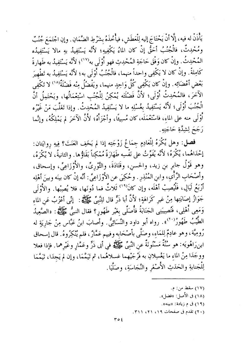 فصل: وهل يُكْرَهُ لِلْعَادِمِ جِمَاعُ زَوْجَتِه إذا لم يخَفِ العَنَتَ؟ فِيهِ رِوايَتان: إحْدَاهُما، يُكْرَهُ؛ لأنَّه يُفَوِّتُ على نَفْسِه طَهَارَةً مُمْكِنًا بَقَاؤُها. والثانيةُ، لا يُكْرَهُ، وهو قَوْلُ جابرِ بنِ زيد، والحسنِ، وقَتَادَةَ، والثَّوْرِيِّ، والأَوْزَاعِيِّ، وإسحاق، وأصْحَابِ الرَّأْىِ، وابنِ المُنْذِرِ. وحُكِىَ عن الأوْزَاعِيِّ: أنَّه إنْ كان بينَه وبينَ أهْلِه أرْبَعُ لَيَالٍ، فَلْيُصِبْ أهْلَه، وإن كانَ (١٩) ثَلاثٌ فما دُونَها، فلا يُصِبْها. والأَوْلَى جَوَازُ إصَابَتِها مِنْ غيرِ كَرَاهَةٍ؛ لأنَّ أبا ذَرٍّ قال للِنَّبِيِّ -صلى اللَّه عليه وسلم-: إنِّي أعْزُبُ عَنِ الماءِ وَمَعِى أَهْلِى، فَتُصِيبَنِى الجَنَابَةُ فأُصَلِّى بِغَيْر طَهُورٍ؟ فقال النبيُّ -صلى اللَّه عليه وسلم-: "الصَّعِيدُ الطَّيِّبُ طَهُورُ (٢٠) ". رواه أبو داود والنَّسَائِيُّ. وأصابَ ابنُ عَبَّاس مِنْ جَارِيَةٍ له رُومِيَّة، وهو عادِمٌ لِلمَاءِ، وصَلَّى بأصْحَابِه وفيهم عَمَّارٌ، فلم يُنْكِرُوهُ. قال إسحاق بن رَاهُويَه: هو سُنَّةٌ مَسْنُونَةٌ عنِ النَّبِيِّ -صلى اللَّه عليه وسلم- فىِ أبى ذَرٍّ وعَمَّارٍ وغَيْرِهما. فإذا فعلا ووجَدَا مِنْ الماءِ ما يَغْسِلانِ به فَرْجَيْهما غسلاهُما، ثم تَيَمَّمَا، وإن لم يَجِدَا، تَيَمَّمَا لِلْجَنابةِ والحَدَثِ الأَصْغَرِ والنَّجَاسَةِ، وصَلَّيَا.