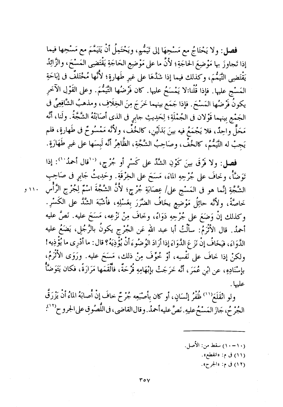 فصل: ولا فَرْقَ بينَ كَوْنِ الشَّدِّ على كَسْرٍ أو جُرْحٍ، [قال أحمدُ] (١٠): إذا تَوَضَّأَ، وخَافَ على جُرْحِهِ الماءَ، مَسَحَ على الخِرْقَةِ. وحَدِيثُ جَابِرٍ في صَاحِبِ الشَّجَّةِ إنَّما هو في المَسْحِ على عِصَابَةِ جُرْحٍ؛ لأَنَّ الشَّجَّةَ اسْمٌ لِجُرْحِ الرَّأْسِ خَاصَّةً، ولأنَّه حائِلُ مَوْضِعٍ يخَافُ الضَّرَرَ بِغَسْلِهِ، فأشْبَهَ الشَّدَّ على الكَسْرِ. وكذلك إنْ وَضَعَ على جُرْحِهِ دَوَاءً، وخَافَ مِنْ نَزْعِه، مَسَحَ عليه. نَصَّ عليه أحمدُ. قال الأثْرَمُ: سألْتُ أبا عبد اللهِ عَن الجُرْحِ يكونُ بالرَّجُلِ، يَضَعُ عليه الدَّوَاءَ، فيَخَافُ إنْ نَزَعَ الدَّوَاءَ إذا أرَادَ الوُضُوءَ أنْ يُؤْذِيَهُ؟ قال: ما أدْرِى ما يُؤذِيه! ولكنْ إذا خَافَ على نَفْسِه، أوْ خُوِّفَ مِنْ ذلك، مَسَحَ عليه. ورَوَى الأثْرَمُ، بإسْنَادِهِ، عن ابْنِ عُمَرَ، أنَّه خَرَجَتْ بإبْهَامِهِ قُرْحَةٌ، فأَلْقَمَها مَرَارَةً، فكان يَتَوَضَّأُ عليها.