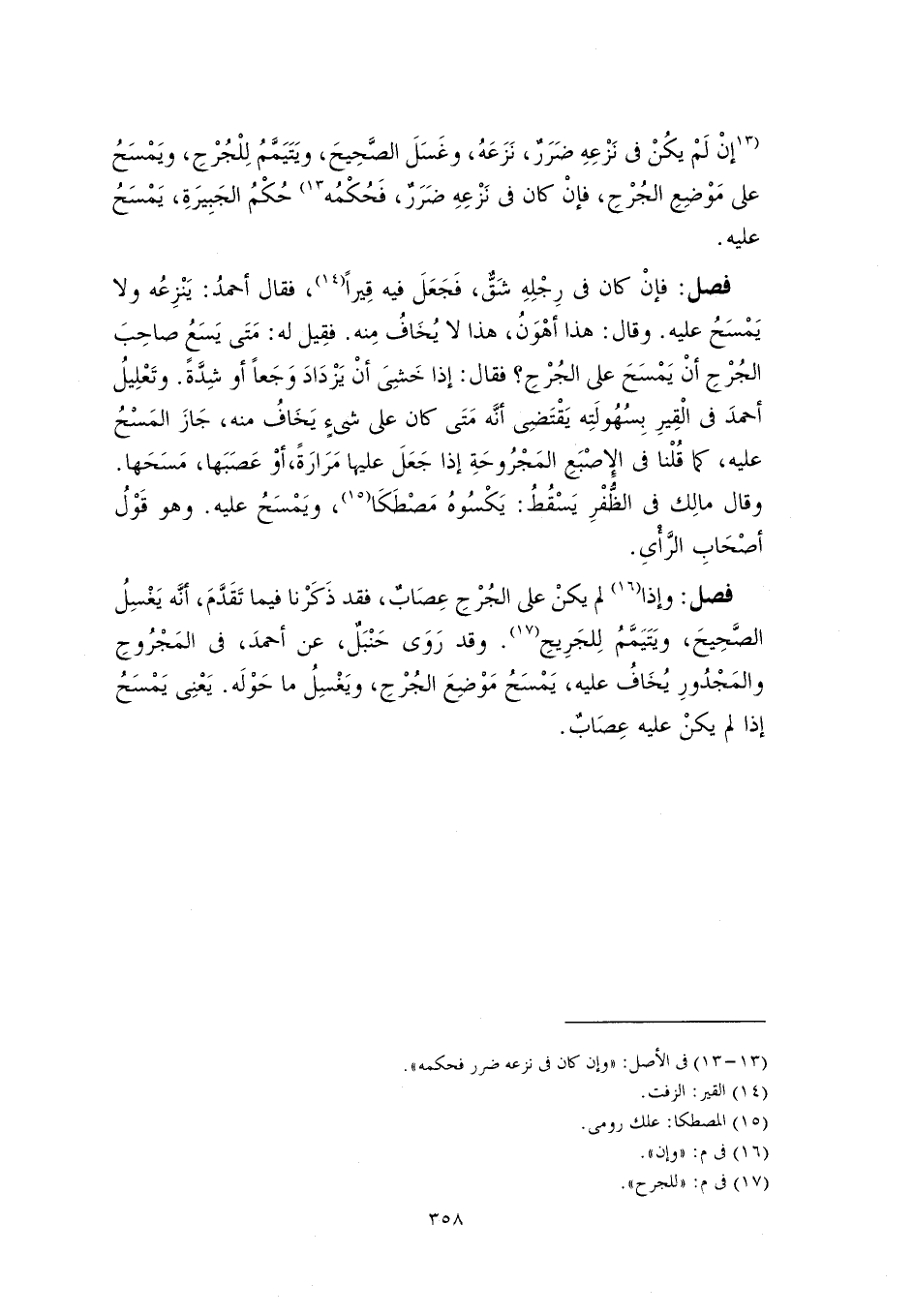 فصل: فإنْ كان في رِجْلِهِ شَقٌّ، فَجَعَلَ فيه قِيرًا (١٤)، فقال أحمدُ: يَنْزِعُه ولا يَمْسَحُ عليه. وقال: هذا أهْوَنُ، هذا لا يُخَافُ مِنه. فقِيل له: مَتَى يَسَعُ صاحِبَ الجُرْحِ أنْ يَمْسَحَ على الجُرْحِ؟ فقال: إذا خَشِىَ أنْ يَزْدَادَ وَجَعًا أو شِدَّةً. وتَعْلِيلُ أحمدَ في الْقِيرِ بِسُهُولَتِه يَقْتَضِى أنَّه مَتَى كان على شيءٍ يَخَافُ منه، جَازَ المَسْحُ عليه، كما قُلْنا في الإِصْبَعِ المَجْرُوحَةِ إذا جَعَلَ عليها مَرَارَةً، أوْ عَصَبَها، مَسَحَها. وقال مالِك في الظُّفْرِ يَسْقُطُ: يَكْسُوهُ مَصْطَكَا (١٥)، ويَمْسَحُ عليه. وهو قَوْلُ أصْحَابِ الرَّأْىِ.