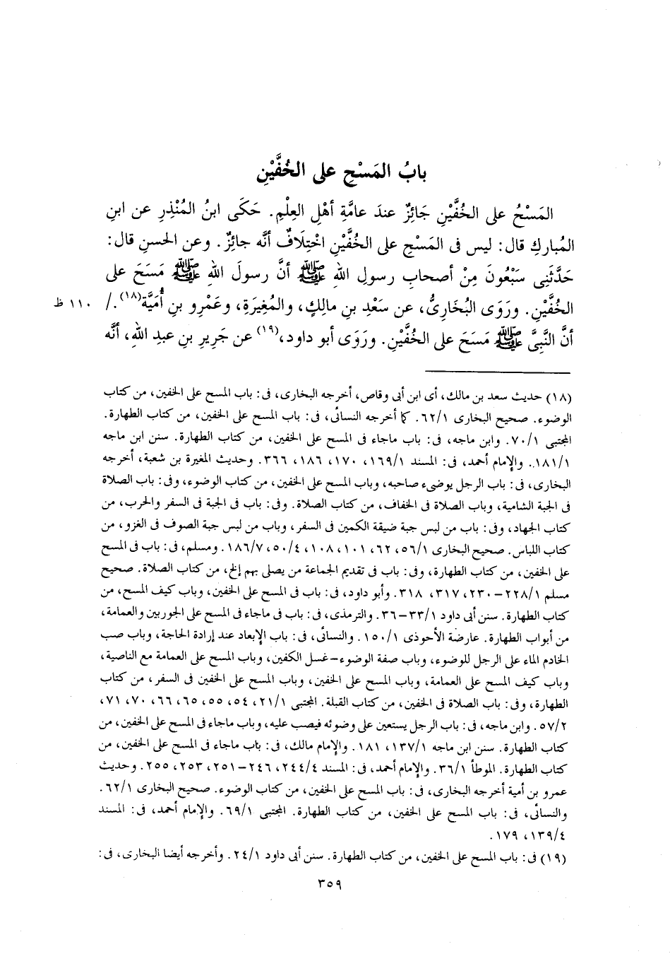 (١٨) حديث سعد بن مالك، أي ابن أبي وقاص، أخرجه البخاري، في: باب المسح على الخفين، من كتاب الوضوء. صحيح البخاري ١/ ٦٢. كما أخرجه النسائي، في: باب المسح على الخفين، من كتاب الطهارة. المجتبى ١/ ٧٠. وابن ماجه، في: باب ما جاء في المسح على الخفين، من كتاب الطهارة. سنن ابن ماجه ١/ ١٨١. والإِمام أحمد، في: المسند ١/ ١٦٩، ١٧٠، ١٨٦، ٣٦٦. وحديث المغيرة بن شعبة، أخرجه البخاري، في: باب الرجل يوضىء صاحبه، وباب المسح على الخفين، من كتاب الوضوء، وفى: باب الصلاة في الجبة الشامية، وباب الصلاة في الخفاف، من كتاب الصلاة. وفى: باب في الجبة في السفر والحرب، من كتاب الجهاد، وفى: باب من لبس جبة ضيقة الكمين في السفر، وباب من لبس جبة الصوف في الغزو، من كتاب اللباس. صحيح البخاري ١/ ٥٦، ٦٢، ١٠١، ١٠٨، ٤/ ٥٠، ٧/ ١٨٦. ومسلم، في: باب في المسح على الخفين، من كتاب الطهارة، وفى: باب في تقديم الجماعة من يصلى بهم إلخ، من كتاب الصلاة. صحيح مسلم ١/ ٢٢٨ - ٢٣٠، ٣١٧، ٣١٨. وأبو داود، في: باب في المسح على الخفين، وباب كيف المسح، من كتاب الطهارة. سنن أبي داود ١/ ٣٣ - ٣٦. والترمذي، في: باب في ما جاء في المسح على الجوربين والعمامة، من أبواب الطهارة. عارضة الأحوذى ١/ ١٥٠. والنسائي، في: باب الإبعاد عند إرادة الحاجة، وباب صب الخادم الماء على الرجل للوضوء، وباب صفة الوضوء - غسل الكفين، وباب المسح على العمامة مع الناصية، وباب كيف المسح على العمامة، وباب المسح على الخفين، وباب المسح على الخفين في السفر، من كتاب الطهارة، وفى: باب الصلاة في الخفين، من كتاب القبلة. المجتبى ١/ ٢١، ٥٤, ٥٥, ٦٥، ٦٦، ٧٠، ٧١، ٢/ ٥٧. وابن ماجه، في: باب الرجل يستعين على وضوئه فيصب عليه، وباب ما جاء في المسح على الخفين، من كتاب الطهارة. سنن ابن ماجه ١/ ١٣٧، ١٨١. والإِمام مالك، في: باب ما جاء في المسح على الخفين، من كتاب الطهارة. الموطأ ١/ ٣٦. والإمام أحمد، في: المسند ٤/ ٢٤٤، ٢٤٦ - ٢٥١، ٢٥٣، ٢٥٥. وحديث عمرو بن أمية أخرجه البخاري، في: باب المسح على الخفين، من كتاب الوضوء. صحيح البخاري ١/ ٦٢. والنسائي، في: باب المسح على الخفين، من كتاب الطهارة. المجتبى ١/ ٦٩. والإِمام أحمد، في: المسند ٤/ ١٣٩، ١٧٩.