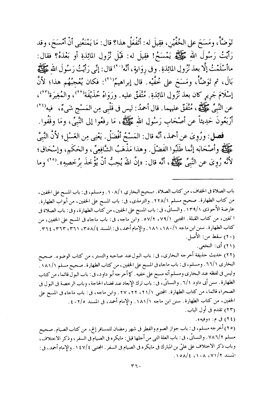 تَوَضَّأَ، ومَسَحَ على الخُفَّيْنِ، فقِيلَ له: أتَفْعَلُ هذا؟ قال: مَا يَمْنَعُنِى أنْ أمْسَحَ، وقد رَأيْتُ رَسُولَ اللهِ -صلى اللَّه عليه وسلم- يَمْسَحُ! فقِيلَ له: قَبْلَ نُزُولِ المائِدَةِ أو بَعْدَهُ؟ فقال: ما أسْلَمْتُ إلَّا بعدَ نُزُولِ المائِدَةِ. وفي رِوَايةٍ، أنَّه (٢٠) قال: إنِّي رَأيْتُ رَسُولَ اللهِ -صلى اللَّه عليه وسلم- بَالَ، ثم تَوَضَّأَ، ومَسَحَ على خُفَّيْه. قال إبراهيمُ (٢١): فكان يُعْجِبُهُم هذا؛ لأنَّ إسْلَامَ جَرِيرٍ كان بعدَ نُزُولِ المائِدَةِ. مُتَّفَقٌ عليه. ورَوَاهُ حُذَيْفَة (٢٢)، والمُغِيرَة (٢٣)، عن النَّبِيِّ -صلى اللَّه عليه وسلم-، مُتَّفَقٌ عليهما. قال أحمدُ: ليس في قَلْبِي مِن المَسْحِ شَيءٌ، فيه (٢٤) أرْبَعُونَ حَدِيثًا عن أصْحَابِ رَسُولِ اللهِ -صلى اللَّه عليه وسلم-، مَا رفعُوا إلى النَّبِيِّ، ومَا وقَفُوا.