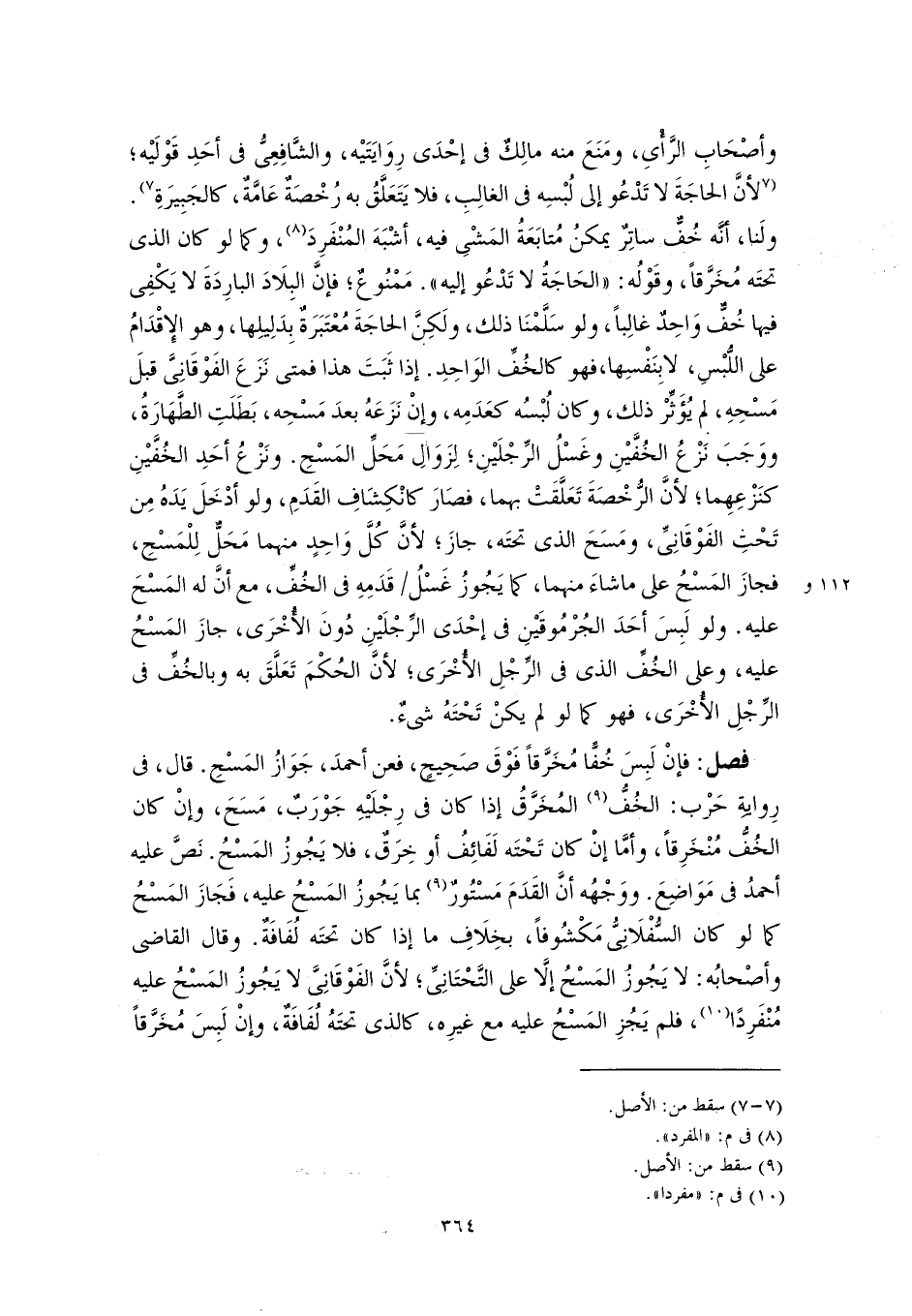 فصل: فإنْ لَبِسَ خُفًّا مُخَرَّقًا فَوْقَ صَحِيحٍ، فعن أحمدَ، جَوَازُ المَسْحِ. قال، في رِوايةِ حَرْب: الخُفُّ (٩) المُخَرَّقُ إذا كان في رِجْلَيْهِ جَوْرَبٌ، مَسَحَ، وإنْ كان الخُفُّ مُنْخَرِقًا، وأمَّا إنْ كان تَحْتَه لَفَائِفُ أو خِرَقٌ، فلا يَجُوزُ المَسْحُ. نَصَّ عليه أحمدُ في مَوَاضِعَ. ووَجْهُه أنَ القَدَمَ مَسْتُورٌ (٩) بما يَجُوزُ المَسْحُ عليه، فَجَازَ المَسْحُ كما لو كان السُّفْلَانِيُّ مَكْشُوفًا، بخِلَافِ ما إذا كان تحتَه لُفَافَةٌ. وقال القاضي وأصْحابُه: لا يَجُوزُ المَسْحُ إلَّا على التَّحْتَانِيِّ؛ لأنَّ الفَوْقَانِيَّ لا يَجُوزُ المَسْحُ عليه مُنْفَرِدًا (١٠)، فلم يَجُزِ المَسْحُ عليه مع غيرِه، كالذى تحتَهُ لُفَافَةٌ، وإنْ لَبِسَ مُخَرَّقًا