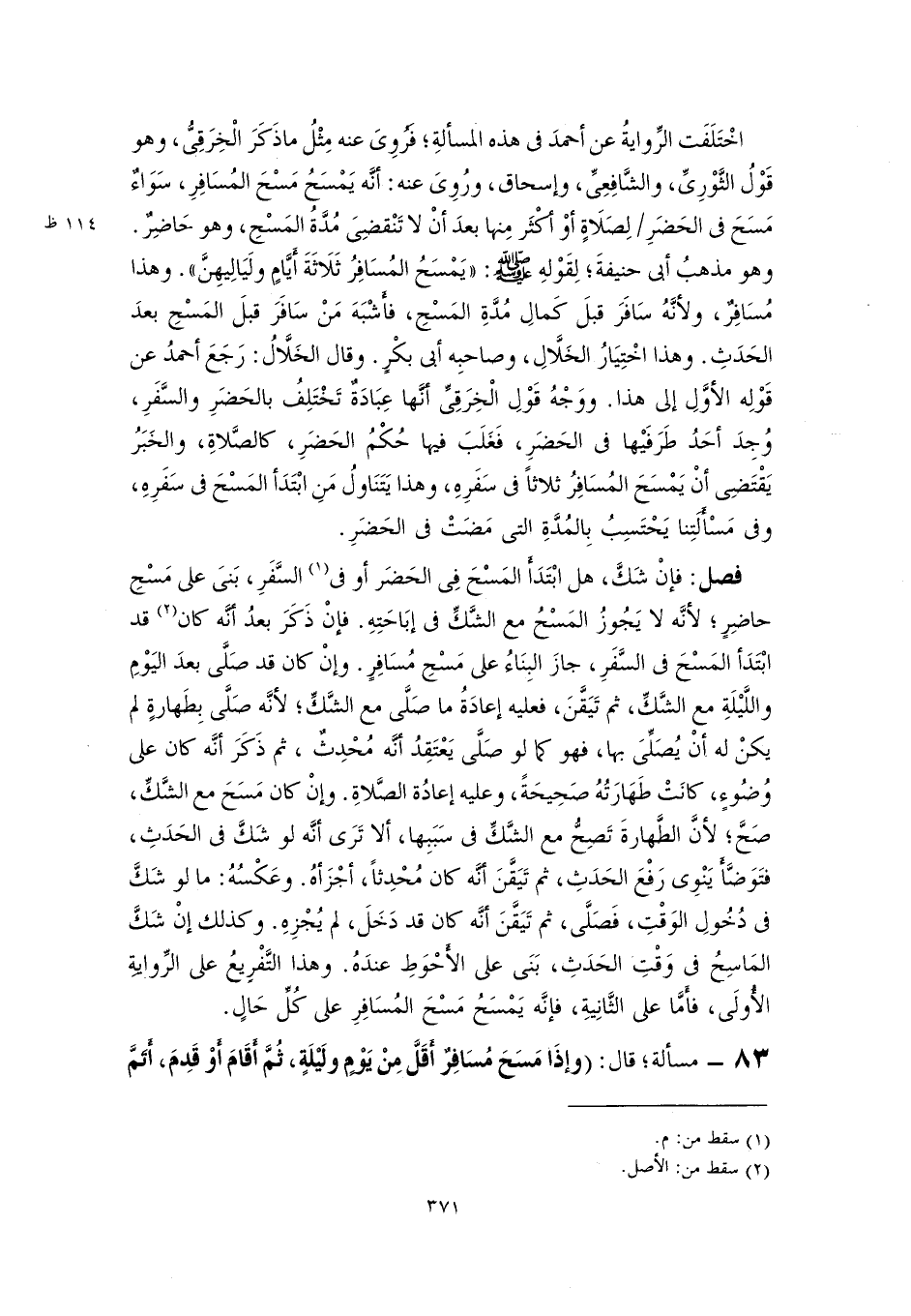 اخْتَلَفَت الرِّوايةُ عن أحمدَ في هذه المسألةِ؛ فَرُوِىَ عنه مِثْلُ ما ذَكَرَ الْخِرَقِىُّ، وهو قَوْلُ الثَّوْرِىِّ، والشَّافِعِىِّ، وإسحاق، ورُوِىَ عنه: أنَّه يَمْسَحُ مَسْحَ المُسَافِرِ، سَوَاءٌ مَسَحَ في الحَضَرِ لِصَلَاةٍ أوْ أَكْثَر مِنها بعدَ أنْ لا تَنْقضِىَ مُدَّةُ المَسْحِ، وهو حَاضِرٌ. وهو مذهبُ أبي حنيفةَ؛ لِقَوْلهِ -صلى اللَّه عليه وسلم-: "يَمْسَحُ المُسَافِرُ ثَلَاثَةَ أَيَّامٍ ولَيَالِيهِنَّ". وهذا مُسَافِرٌ، ولأنَّهُ سَافَرَ قبلَ كَمالِ مُدَّةِ المَسْحِ، فأَشْبَهَ مَنْ سَافَرَ قبلَ المَسْحِ بعدَ الحَدَثِ. وهذا اخْتِيَارُ الخَلَّالِ، وصاحبِه أبى بكْرٍ. وقال الخَلَّالُ: رَجَعَ أحمدُ عن قَوْلِه الأوَّلِ إلى هذا. ووَجْهُ قَوْلِ الْخِرَقِيِّ أَنَّها عِبَادَةٌ تَخْتَلِفُ بالحَضَرِ والسَّفَرِ، وُجِدَ أحَدُ طَرَفَيْها في الحَضَرِ، فَغَلَبَ فيها حُكْمُ الحَضَرِ، كالصَّلاةِ، والخَبَرُ يَقْتَضِى أنْ يَمْسَحَ المُسَافِرُ ثلاثًا في سَفَرِهِ، وهذا يَتَنَاولُ مَنِ ابْتَدَأ المَسْحَ في سَفَرِهِ، وفي مَسْأَلَتِنا يَحْتَسِبُ بِالمُدَّةِ التي مَضَتْ في الحَضَرِ.
