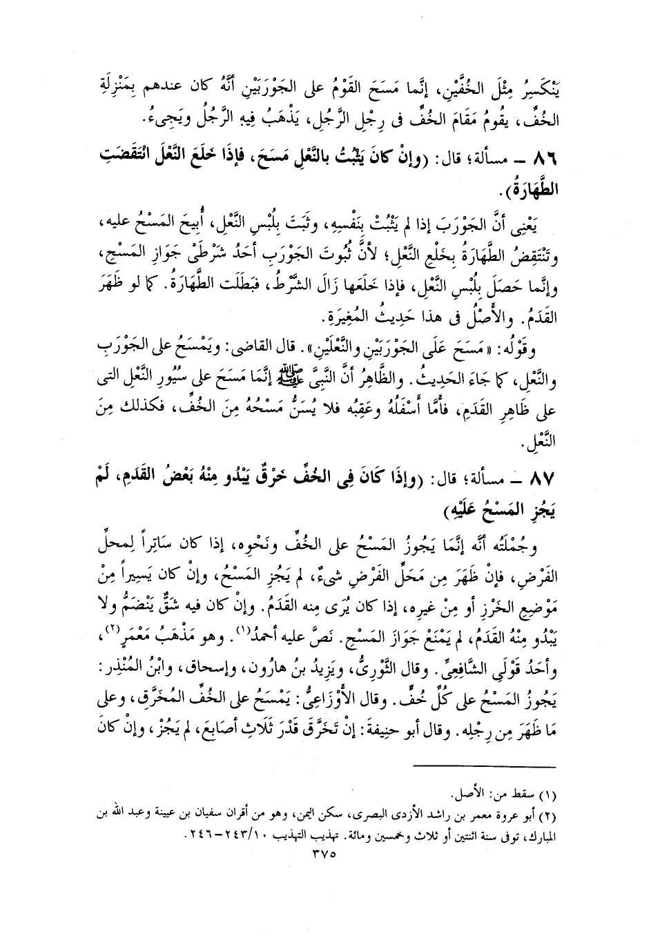 وقَوْلُه: "مَسَحَ عَلَى الجَوْرَبَيْنِ والنَّعْلَيْنِ". قال القاضي: ويَمْسَحُ على الجَوْرَبِ والنَّعْلِ، كما جَاءَ الحَدِيثُ. والظَّاهِرُ أنَّ النَّبِىَّ -صلى اللَّه عليه وسلم- إنَّمَا مَسَحَ على سُيُورِ النَّعْلِ التي على ظَاهِرِ القَدَمِ، فأَمَّا أَسْفَلُهُ وعَقِبُه فلا يُسَنُّ مَسْحُهُ مِنَ الخُفِّ، فكذلك مِنَ النَّعْلِ.