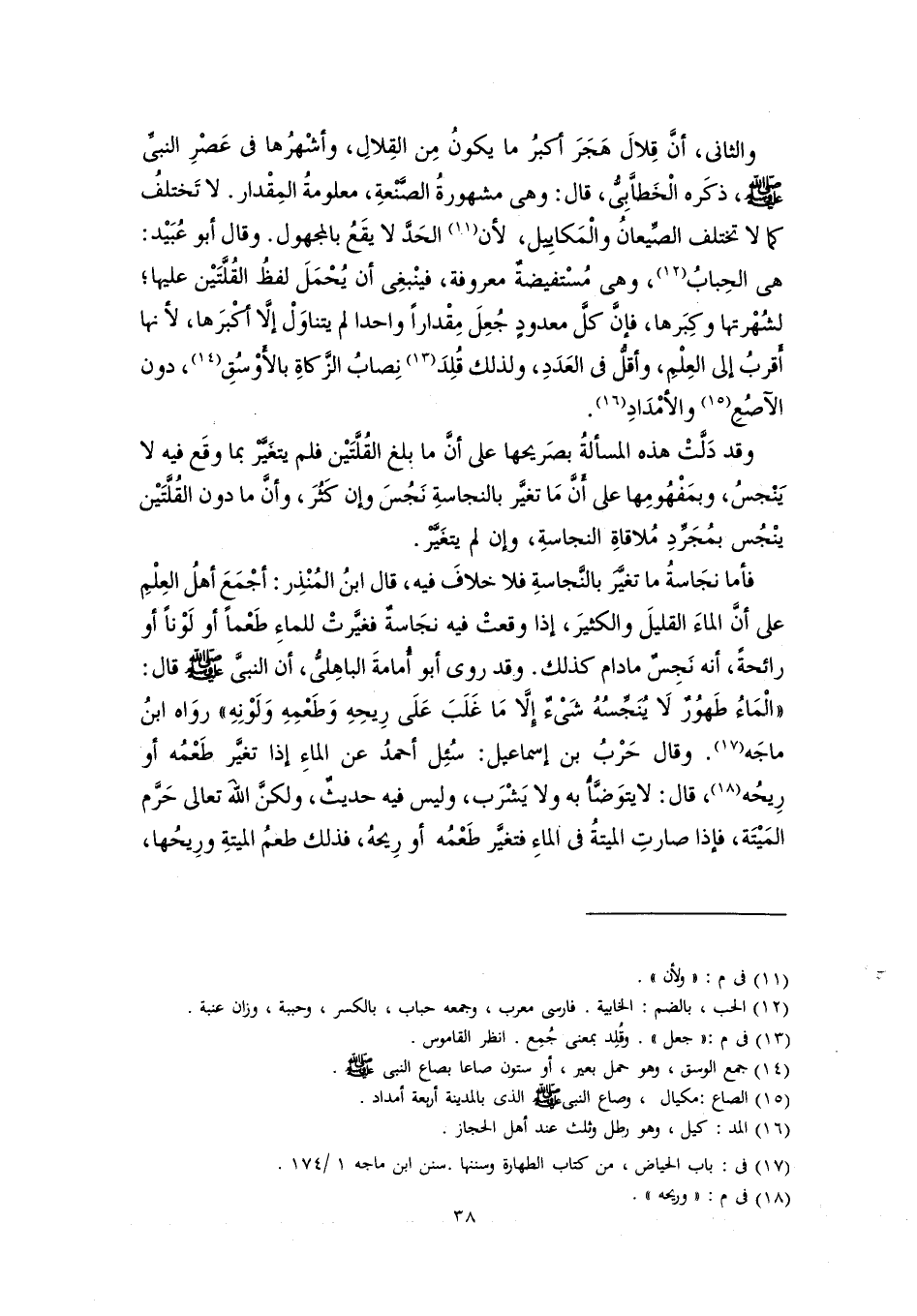 والثانى، أنَّ قلالَ هَجَرَ أكبرُ ما يكونُ مِن القِلالِ، وأشْهرُها في عَصْرِ النبيِّ -صلى اللَّه عليه وسلم-، ذكَره الْخَطَّابِىُّ، قال: وهى مشهورةُ الصَّنْعةِ، معلومةُ المِقْدار. لا تَختلفُ كما لا تختلف الصِّيعانُ والْمَكايِيل، لأن (١١) الحَدَّ لا يقَعُ بالمجهول. وقال أبو عُبَيْد: هي الحِبابُ (١٢)، وهى مُسْتفيضةٌ معروفة، فينْبغِى أن يُحْمَلَ لفظُ القُلَّتَيْن عليها؛ لشُهْرتها وكِبَرها، فإنَّ كلَّ معدودٍ جُعِلَ مِقْدارًا واحدا لم يتناوَلْ إلَّا أكْبرَها، لأنها أَقربُ إلى العِلْمِ، وأقلُّ في العَدَدِ، ولذلك قُلِدَ (١٣) نِصابُ الزَّكاةِ بالأَوْسُقِ (١٤)، دون الآصُعِ (١٥) والأمْدَادِ (١٦).