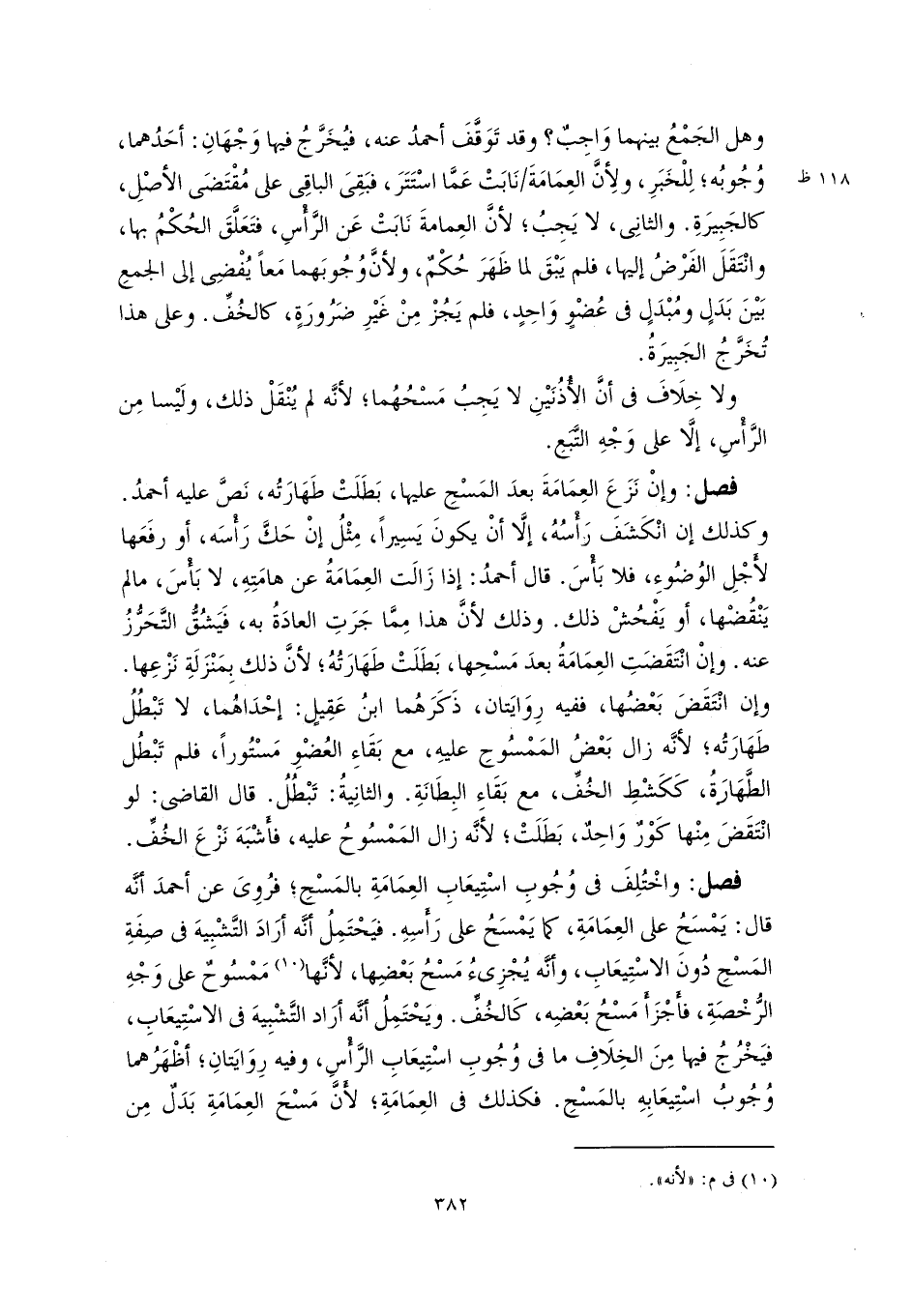 فصل: واخْتُلِفَ في وُجُوبِ اسْتِيعَابِ العِمَامَةِ بالمَسْحِ؛ فرُوِىَ عن أحمدَ أنَّه قال: يَمْسَحُ على العِمَامَةِ، كما يَمْسَحُ على رَأسِهِ. فيَحْتَمِلُ أنَّه أرَادَ التَّشْبِيهَ في صِفَةِ المَسْحِ دُونَ الاسْتِيعَابِ، وأنَّه يُجْزِىءُ مَسْحُ بَعْضِها، لأنَّها (١٠) مَمْسُوحٌ على وَجْهِ الرُّخْصَةِ، فأَجْزَأَ مَسْحُ بَعْضِه، كَالخُفِّ. ويَحْتَمِلُ أنَّه أرَاد التَّشْبِيهَ في الاسْتِيعَابِ، فيَخْرُجُ فيها مِنَ الخِلَافِ ما في وُجُوبِ اسْتِيعَابِ الرَّأْسِ، وفيه رِوَايَتانِ؛ أظْهَرُهما وُجُوبُ اسْتِيعَابِهِ بالمَسْحِ. فكذلك في العِمَامَةِ؛ لأَنَّ مَسْحَ العِمَامَةِ بَدَلٌ مِن
