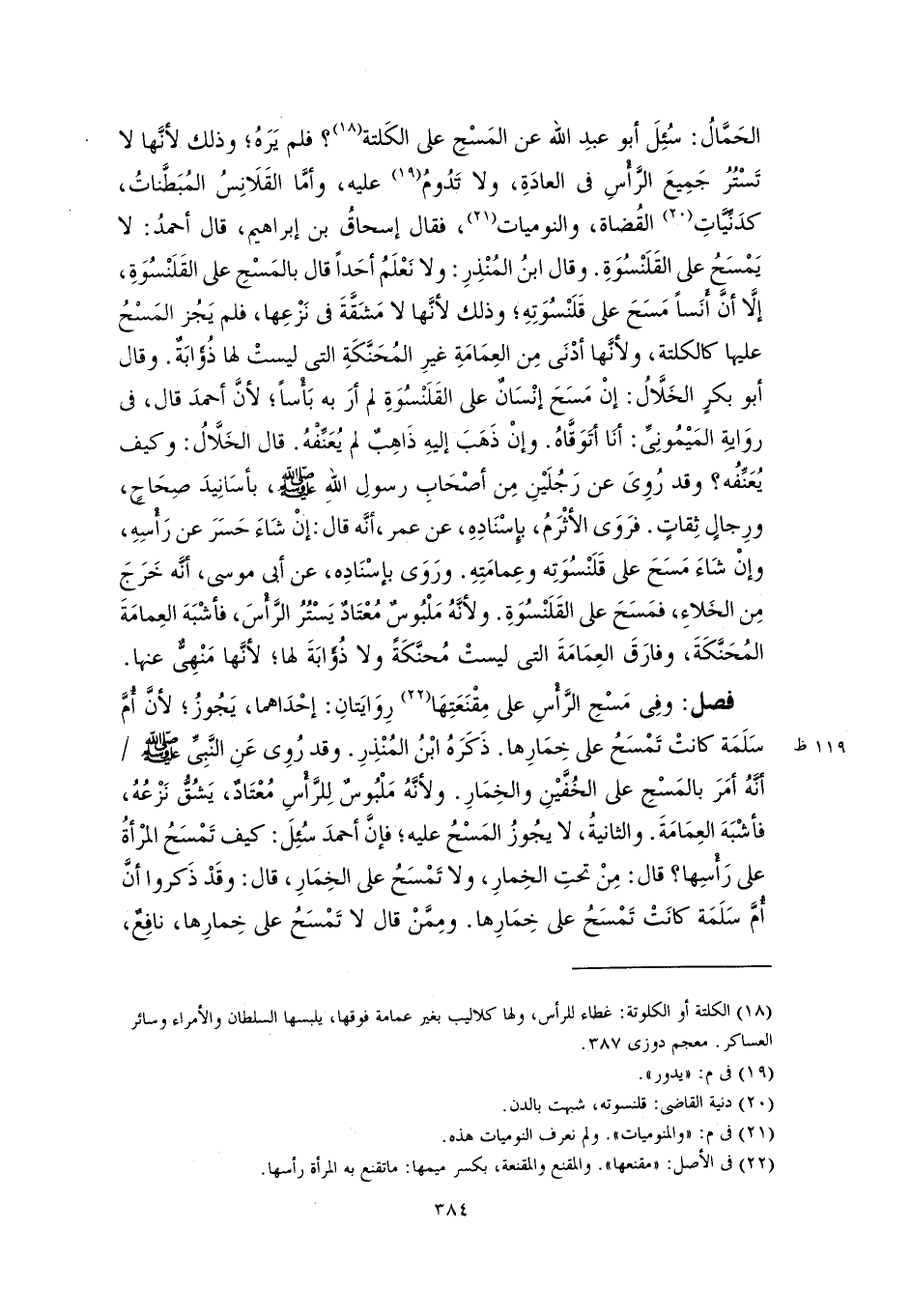 الحَمَّالُ: سُئِلَ أبو عبدِ اللَّه عن المَسْحِ على الكَلتة (١٨)؟ فلم يَرَهُ؛ وذلك لأنَّها لا تَسْتُرُ جَمِيعَ الرَّأْسِ في العادَةِ، ولا تَدُومُ (١٩) عليه، وأمَّا القَلَانِسُ المُبَطَّناتُ، كدَنِّيَّاتِ (٢٠) القُضاة، والنوميات (٢١)، فقال إسحاقُ بن إبراهيم، قال أحمدُ: لا يَمْسَحُ على القَلَنْسُوَةِ. وقال ابنُ المُنْذِرِ: ولا نَعْلَمُ أحَدًا قال بالمَسْحِ على القَلَنْسُوَةِ، إلَّا أنَّ أَنَسًا مَسَحَ على قَلَنْسُوَتِهِ؛ وذلك لأنَّها لا مَشَقَّةَ في نَزْعِها، فلم يَجُز المَسْحُ عليها كالكلتة، ولأنَّها أدْنَى مِن العِمَامَةِ غيرِ المُحَنَّكَةِ التي ليستْ لها ذُؤَابَةٌ. وقال أبو بكرٍ الخَلَّالُ: إنْ مَسَحَ إنْسَانٌ على القَلَنْسُوَةِ لم أرَ به بَأْسًا؛ لأنَّ أحمدَ قال، في روَايةِ المَيْمُونِىِّ: أنَا أتَوَقَّاهُ. وإنْ ذَهَبَ إليهِ ذَاهِبٌ لم يُعَنِّفْهُ. قال الخَلَّالُ: وكيف يُعَنِّفُه؟ وقد رُوِىَ عن رَجُلَيْنِ مِن أصْحَابِ رسولِ اللهِ -صلى اللَّه عليه وسلم-، بأسَانِيدَ صِحَاحٍ، ورِجالٍ ثِقاتٍ. فرَوَى الأثْرَمُ، بإسْنَادِهِ، عن عمر، أنَّه قال: إنْ شَاءَ حَسَرَ عن رَأْسِهِ، وإنْ شَاءَ مَسَحَ على قَلَنْسُوَتِه وعِمامَتِهِ. ورَوَى بإسْنَادِه، عن أبي موسى، أنَّه خَرَجَ مِن الخَلاءِ، فمَسَحَ على القَلَنْسُوَةِ. ولأنَّهُ مَلْبُوسٌ مُعْتَادٌ يَسْتُرُ الرَّأْسَ، فأشْبَهَ العِمامَةَ المُحَنَّكَةَ، وفارَقَ العِمَامَةَ التي ليستْ مُحنَّكَةً ولا ذُؤَابَةَ لها؛ لأنَّها مَنْهِىٌّ عنها.