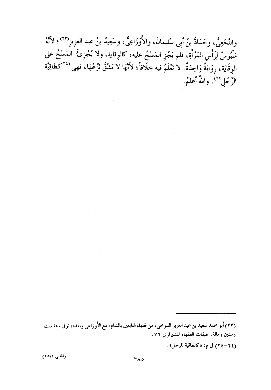 والنَّخَعِىُّ، وحَمَادُّ بنُ أبِى سُليمانَ، والأَوْزَاعِىُّ، وسَعِيدُ بنُ عبد العزِيزِ (٢٣)؛ لأنَّهُ مَلْبُوسٌ لِرَأْسِ المَرْأَةِ، فلم يَجُزِ المَسْحُ عليه، كالوِقايةِ، ولا يُجْزِئُ المَسْحُ على الوِقَايَةِ، رِوَايَةً وَاحِدَةً. لا نَعْلَمُ فيه خِلَافًا؛ لأنَّهَا لا يَشُقُّ نَزْعُهَا، فهى [كطاقِيَّةِ الرَّجُلِ] (٢٤). واللهُ أعلمُ.