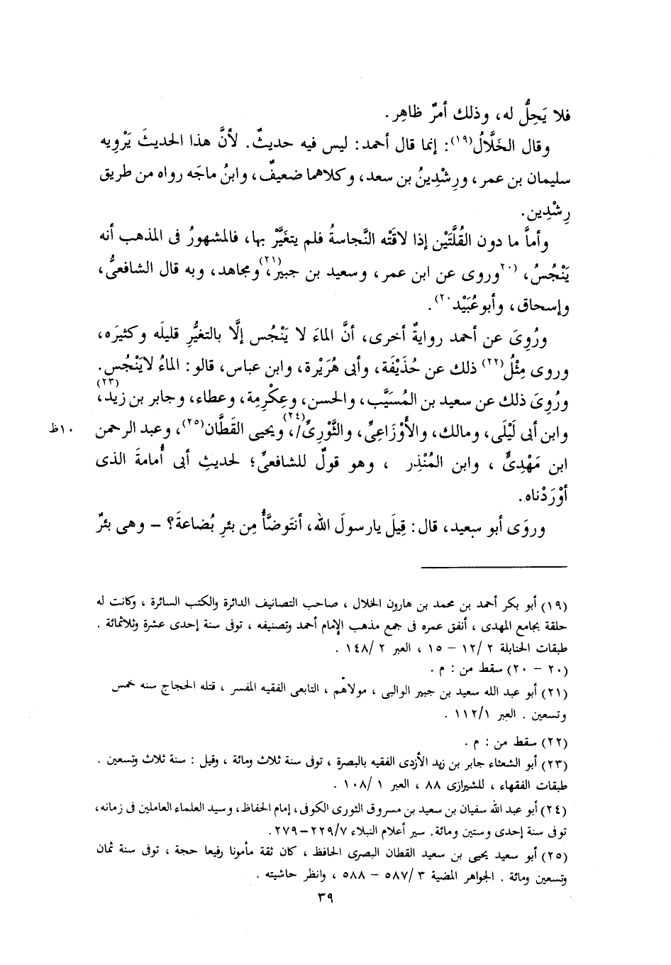 (١٩) أبو بكر أحمد بن محمد بن هارون الخلال، صاحب التصانيف الدائرة والكتب السائرة، وكانت له حلقة بجامع المهدى، أنفق عمره في جمع مذهب الإمام أحمد وتصنيفه، توفى سنة إحدى عشرة وثلاثمائة. طبقات الحنابلة ٢/ ١٢ - ١٥، العبر ٢/ ١٤٨.
