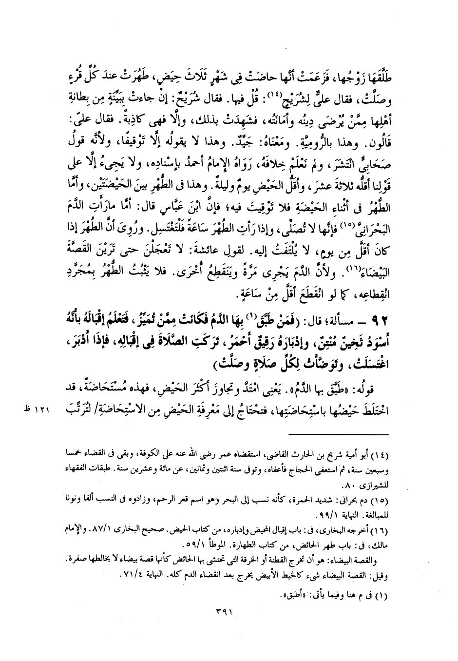(١٥) دم بحرانى: شديد الحمرة، كأنه نسب إلى البحر وهو اسم قعر الرحم، وزادوه في النسب ألفا ونونا للمبالغة. النهاية ١/ ٩٩.