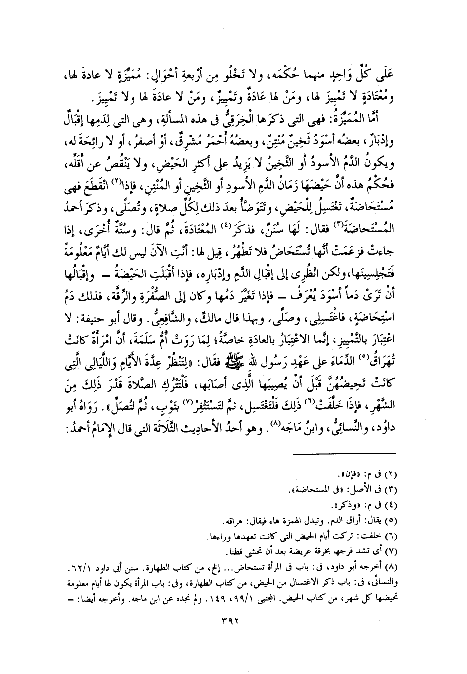 أمَّا المُمَيِّزَةُ: فهى التي ذكرَها الْخِرَقِىُّ في هذه المسألةِ، وهى التي لِدَمِها إقْبَالٌ وإدْبَارٌ، بعضُه أسْوَدُ ثَخِينٌ مُنْتِنٌ، وبعضُهُ أَحْمَرُ مُشْرِقٌ، أوْ أصفرُ، أو لا رائِحَةَ له، ويكونُ الدَّمُ الأسودُ أو الثَّخِينُ لا يَزِيدُ على أكثرِ الحَيْضِ، ولا يَنْقُصُ عن أَقَلِّه، فحُكْمُ هذه أنَّ حَيْضَهَا زَمَانُ الدَّمِ الأسودِ أو الثَّخِينِ أو المُنْتِنِ، فإذا (٢) انْقَطَعَ فهى مُسْتَحَاضَةٌ، تَغْتَسِلُ لِلْحَيْض، وتَتَوَضَّأُ بعدَ ذلك لِكُلِّ صلاةٍ، وتُصَلِّى، وذكرَ أحمدُ المُسْتَحاضَةَ (٣) فقال: لَهَا سُنَنٌ، فذكَرَ (٤) المُعْتَادَةَ، ثُمَّ قال: وسُنَّةٌ أُخْرَى، إذا جاءتْ فزعَمَتْ أنَّها تُسْتَحَاضُ فلا تَطْهُرُ، قِيل لها: أنْتِ الآنَ ليس لك أيَّامٌ مَعْلُومَةٌ فَتَجْلِسِينَها، ولكن انْظُرِى إلى إقْبَالِ الدَّمِ وإدْبَارِه، فإذا أقْبَلَتِ الحَيْضَةُ - وإقْبَالُها أنْ تَرَىْ دَمًا أسْوَدَ يُعْرَفُ - فإذا تَغَيَّرَ دَمُها وكان إلى الصُّفْرَةِ والرِّقَّة، فذلك دَمُ اسْتِحَاضَةٍ، فاغْتَسِلِى، وصَلِّى. وبهذا قال مالكٌ، والشَّافِعِىُّ. وقال أبو حنيفة: لا اعْتِبَارَ بالتَّمْيِيزِ، إنَّما الاعْتِبَارُ بالعادَةِ خاصَّةً؛ لِمَا رَوَتْ أُمُّ سَلَمَةَ، أنَّ امْرَأَةً كانَتْ تُهَرَاقُ (٥) الدِّمَاءَ على عَهْدِ رَسُول للَّه -صلى اللَّه عليه وسلم- فقَال: "لِتَنْظُرْ عِدَّةَ الأَيَّامِ وَاللَّيَالِى الَّتِى كانَتْ تَحِيضُهُنَّ قَبْلَ أنْ يُصِيبَها الَّذِى أصَابَها، فَلْتَتْرُكِ الصَّلاةَ قَدْرَ ذَلِكَ مِنَ الشَّهْرِ، فإذَا خَلَّفَتْ (٦) ذَلِكَ فَلْتَغْتَسِل، ثمَّ لتَسْتَثْفِرْ (٧) بثَوْبٍ، ثُمَّ لتُصَلِّ". رَوَاهُ أبو داوُد، والنَّسائِىُّ، وابنُ مَاجَه (٨). وهو أحدُ الأحادِيث الثَّلَاثَة التي قال الإِمَامُ أحمدُ: