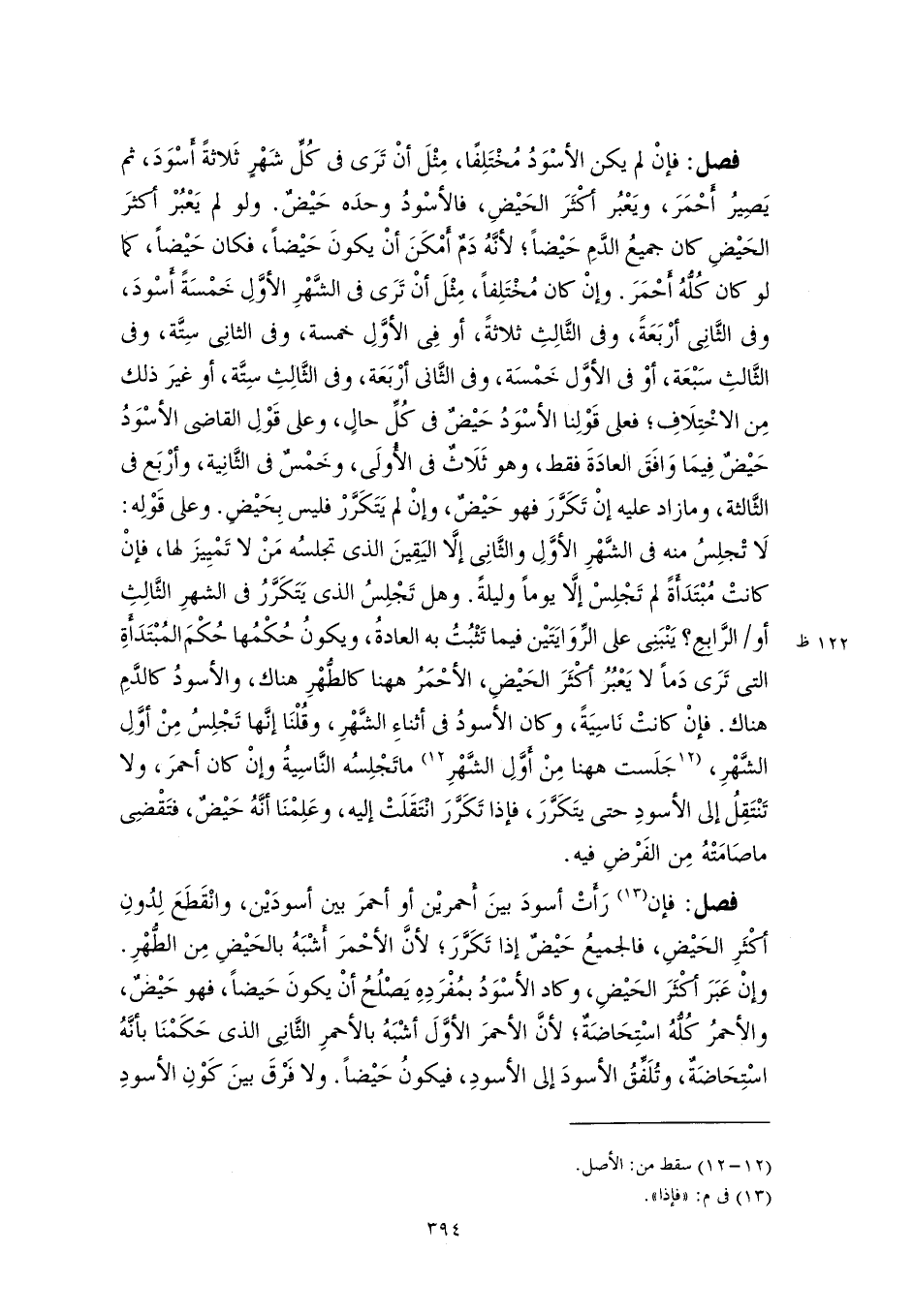 فصل: فإن (١٣) رَأَتْ أسودَ بينَ أَحمريْن أو أحمرَ بين أسودَيْن، وانْقَطَعَ لِدُونِ أكْثَرِ الحَيْضِ، فالجميعُ حَيْضٌ إذا تَكَرَّرَ؛ لأنَّ الأحْمرَ أَشْبَهُ بالحَيْضِ مِن الطُّهْرِ. وإنْ عَبَرَ أكْثَرَ الحَيْضِ، وكاد الأسْوَدُ بمُفْرَدِهِ يَصْلُحُ أنْ يكونَ حَيضًا، فهو حَيْضٌ، والأحمرُ كُلُّهُ اسْتِحَاضَةٌ؛ لأنَّ الأحمرَ الأوَّلَ أشْبَهُ بالأحمرِ الثَّانِى الذي حَكَمْنَا بأنَّهُ اسْتِحَاضَةٌ، وتُلَفِّقُ الأسودَ إلى الأسودِ، فيكونُ حَيْضًا. ولا فَرْقَ بينَ كَوْنِ الأسودِ