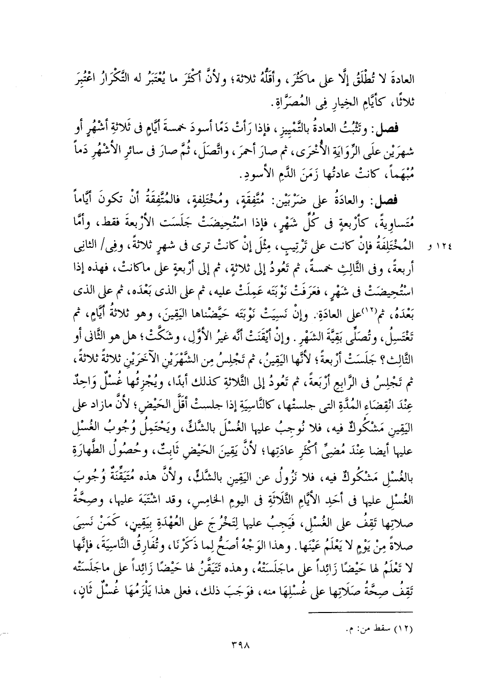 فصل: والعادَةُ على ضَرْبَيْن: مُتَّفِقَةٍ، ومُخْتَلِفةٍ، فالمُتَّفِقَةُ أنْ تكونَ أيَّامًا مُتَساوِيةً، كأرْبعةٍ في كُلِّ شَهْرٍ، فإذا اسْتُحِيضَتْ جَلَسَت الأرْبعةَ فقط، وأمَّا المُخْتَلِفَةُ فإنْ كانت على تَرْتِيبٍ، مِثْلَ إنْ كانتْ ترى في شهرٍ ثلاثةً، وفِي الثانِى أربعةً، وفى الثَّالِثِ خمسةً، ثم تَعُودُ إلى ثلاثةٍ، ثم إلى أرْبعةٍ على ما كانتْ، فهذه إذا اسْتُحِيضَتْ في شَهْرٍ، فعَرَفَتْ نَوْبَتَه عَمِلَتْ عليه، ثم على الذي بَعْدَه، ثم على الذي بَعْدَهُ، ثم (١٢) على العادَةِ. وإنْ نَسِيَتْ نَوْبَتَه حَيَّضْناها اليَقِينَ، وهو ثلاثةُ أيَّامٍ، ثم تَغْتَسِلُ، وتُصَلِّى بَقِيَّةَ الشَهْرِ. وإنْ أيْقَنَتْ أنَّه غيرُ الأوَّلِ، وشَكَّتْ؛ هل هو الثَّانى أو الثَّالِث؟ جَلَسَتْ أرْبعةً؛ لأنَّها اليَقِينُ، ثم تَجْلِسُ مِن الشَّهْرَيْنِ الآخَرَيْنِ ثلاثةً ثلاثةً، ثم تَجْلِسُ في الرَّابعِ أرْبَعةً، ثم تَعُودُ إلى الثَّلاثةِ كذلك أبدًا، ويُجْزِئُها غُسْلٌ وَاحِدٌ عِنْدَ انْقِضَاءِ المُدَّةِ التي جلستْها، كالنَّاسِيَةِ إذا جلستْ أقَلَّ الحَيْضِ؛ لأنَّ ما زاد على اليَقِينِ مَشْكُوكٌ فيه، فلا نُوجِبُ عليها الغُسْلَ بالشَّكِّ، ويَحْتَمِلُ وُجُوبُ الغُسْلِ عليها أيضًا عِنْدَ مُضِىِّ أكثَرِ عادَتِها؛ لأنَّ يَقِينَ الحَيْضِ ثَابِتٌ، وحُصُولُ الطَّهارَةِ بالغُسْلِ مَشْكُوكٌ فيه، فلا نَزُولُ عن اليَقِينِ بالشَّكِّ، ولأنَّ هذه مُتَيَقِّنَةٌ وُجُوبَ الغُسْلِ عليها في أحَدِ الأيَّامِ الثَّلَاثَةِ في اليومِ الخامِسِ، وقد اشْتَبَهَ عليها، وصِحَّةُ صلاتِها تَقِفُ على الغُسْلِ، فَيَجِبُ عليها لِتَخْرُجَ على العُهْدَةِ بِيَقِينٍ، كَمَنْ نَسِىَ صلاةً مِنْ يَومٍ لا يَعْلَمُ عَيْنَها. وهذا الوَجْهُ أصَحُّ لِما ذَكَرْنَا، وتُفَارِقُ النَّاسِيَةَ، فإنَّها لا تَعْلَمُ لها حَيْضًا زَائِدًا على ما جَلَسَتْهُ، وهذه تَتَيَقَّنُ لها حَيْضًا زَائِدًا على ما جَلَسَتْه تَقِفُ صِحَّةُ صَلَاتِها على غُسْلِهَا منه، فوَجَبَ ذلك، فعلى هذا يَلْزَمُهَا غُسْلٌ ثَانٍ،