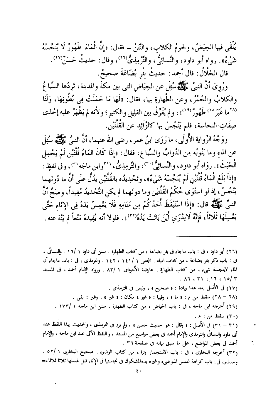 يُلْقَى فيها الحِيَضُ، ولحومُ الكلابِ، والنَّتَنُ - فقال: "إِنَّ الْمَاءَ طَهُورٌ لَا يُنَجِّسُهُ شَىْءٌ". رواه أبو داود، والنَّسائِىُّ، والتِّرْمِذِىُّ (٢٦)، وقال: حديثٌ حَسَنٌ (٢٧).