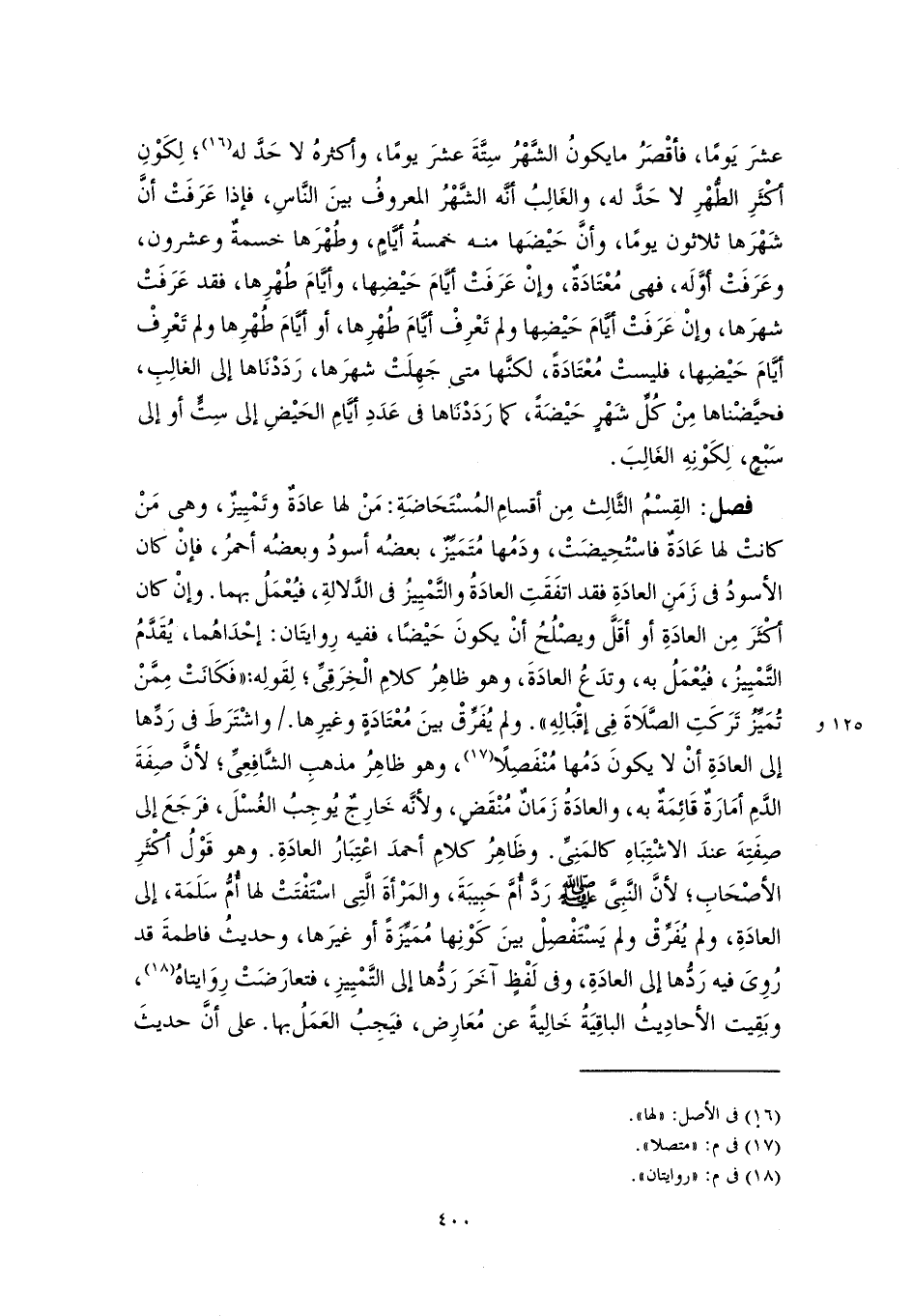 فصل: القِسْمُ الثَّالِث مِن أقسامِ المُسْتَحَاضَةِ: مَنْ لها عادَةٌ وتَمْيِيزٌ، وهى مَنْ كانتْ لها عَادَةٌ فاسْتُحِيضَتْ، ودَمُها مُتَمَيِّزٌ، بعضُه أسودُ وبعضُه أحمرُ، فإنْ كان الأسودُ في زَمَنِ العادَةِ فقد اتفَقَتِ العادَةُ والتَّمْيِيزُ في الدَّلالةِ، فيُعْمَلُ بهما. وإنْ كان أكْثَرَ مِن العادَةِ أو أقَلَّ ويصْلُحُ أنْ يكونَ حَيْضًا، ففيه رِوايتَان: إحْدَاهُما، يُقَدَّمُ التَّمْيِيزُ، فيُعْمَلُ به، وتدَعُ العادَةَ، وهو ظاهِرُ كلامِ الْخِرَقِىِّ؛ لِقَولِه: "فَكَانَتْ مِمَّنْ تُمَيِّزُ تَرَكَتِ الصَّلَاةَ في إقْبَالِهِ". ولم يُفَرِّقْ بينَ مُعْتَادَةٍ وغيرِها. واشْتَرَطَ في رَدِّها إلى العادَةِ أنْ لا يكونَ دَمُها مُنْفَصِلًا (١٧)، وهو ظاهِرُ مذهبِ الشَّافِعِىِّ؛ لأنَّ صِفَةَ الدَّمِ أمَارَةٌ قَائِمَةٌ به، والعادَةُ زَمَانٌ مُنْقَضٍ، ولأنَّه خَارِجٌ يُوجِبُ الغُسْلَ، فرَجَعَ إلى صِفَتِهَ عندَ الاشْتِبَاهِ كالمَنِىِّ. وظَاهِرُ كلامِ أحمدَ اعْتِبَارُ العادَةِ. وهو قَوْلُ أكْثَرِ الأصْحَابِ؛ لأنَّ النَّبِىَّ -صلى اللَّه عليه وسلم- رَدَّ أُمَّ حَبِيبَةَ، والمَرْأةَ الَّتِى اسْتَفْتَتْ لها أُمُّ سَلَمَة، إلى العادَةِ، ولم يُفَرِّقْ ولم يَسْتَفْصِلْ بينَ كَوْنِها مُمَيِّزَةً أو غيرَها، وحديثُ فاطمةَ قد رُوِىَ فيه رَدُّها إلى العادَةِ، وفى لَفْظٍ آخَرَ رَدُّها إلى التَّمْيِيزِ، فتعارَضَتْ رِوَايتاهُ (١٨)، وبَقِيت الأحادِيثُ الباقِيَةُ خَالِيةً عن مُعَارِض، فيَجِبُ العَمَلُ بها. على أنَّ حديثَ