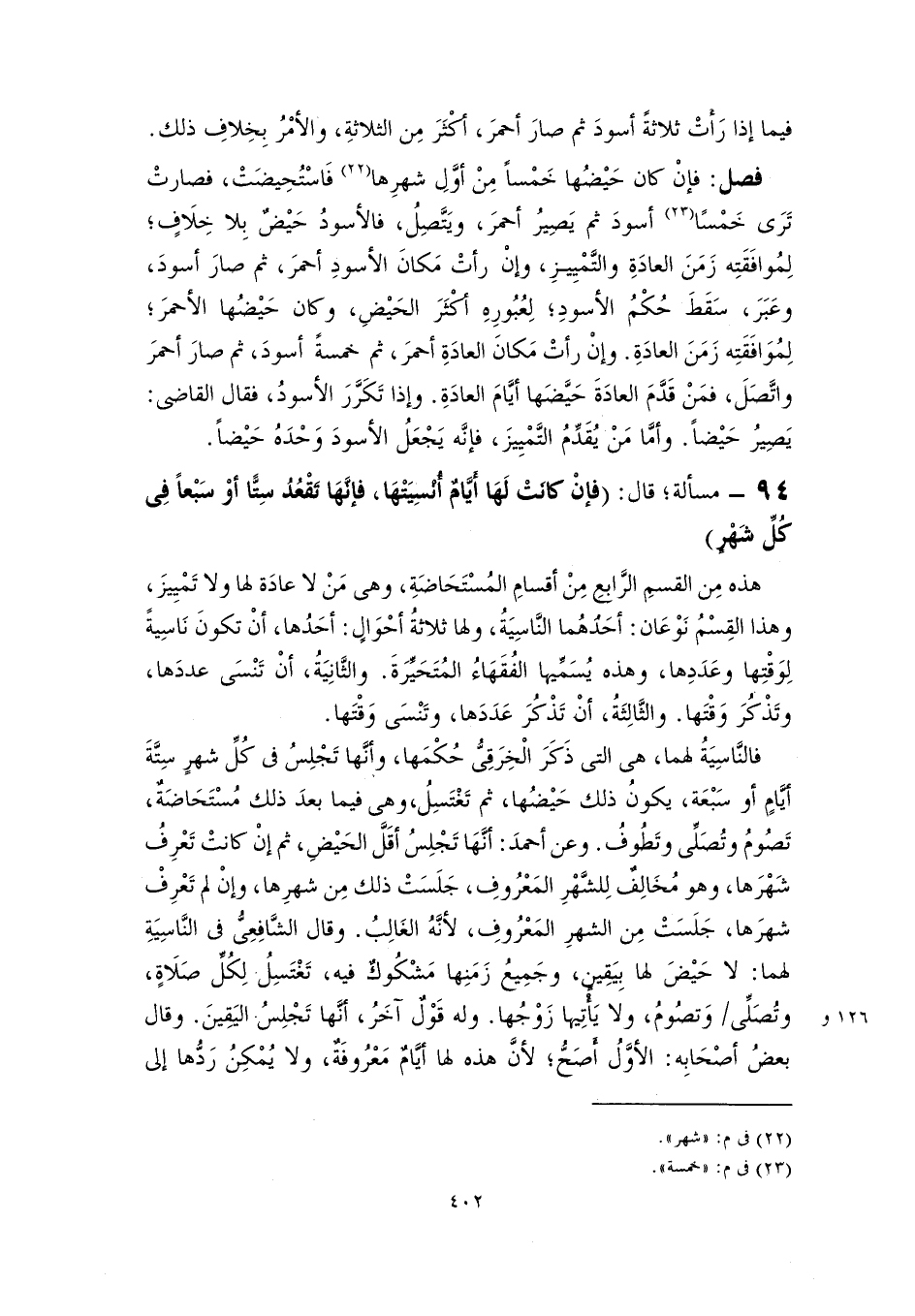 فالنَّاسِيَةُ لهما، هي التي ذَكَرَ الْخِرَقِىُّ حُكْمَها، وأنَّها تَجْلِسُ في كُلِّ شهرٍ سِتَّةَ أيَّامٍ أو سَبْعَة، يكونُ ذلك حَيْضُها، ثم تَغْتَسِلُ، وهى فيما بعدَ ذلك مُسْتَحَاضَةٌ، تَصُومُ وتُصَلِّى وتَطُوفُ. وعن أحمدَ: أنَّهَا تَجْلِسُ أقَلَّ الحَيْضِ، ثم إنْ كانتْ تَعْرِفُ شَهْرَها، وهو مُخَالِفٌ لِلشَّهْرِ المَعْرُوفِ، جَلَسَتْ ذلك مِن شهرِها، وإنْ لم تَعْرِفْ شهرَها، جَلَسَتْ مِن الشهرِ المَعْرُوفِ، لأنَّهُ الغَالِبُ. وقال الشَّافِعِىُّ في النَّاسِيَةِ لهما: لا حَيْضَ لها بِيَقِينٍ، وجَمِيعُ زَمَنِها مَشْكُوكٌ فيه، تَغْتَسِلُ لِكُلِّ صَلَاةٍ، وتُصَلِّى وَتصُومُ، ولا يَأْتِيها زَوْجُها. وله قَوْلٌ آخَرُ، أنَّها تَجْلِسُ اليَقِينَ. وقال بعضُ أصْحَابِه: الأوَّلُ أَصَحُّ؛ لأنَّ هذه لها أيَّامٌ مَعْرُوفَةٌ، ولا يُمْكِنُ رَدُّها إلى