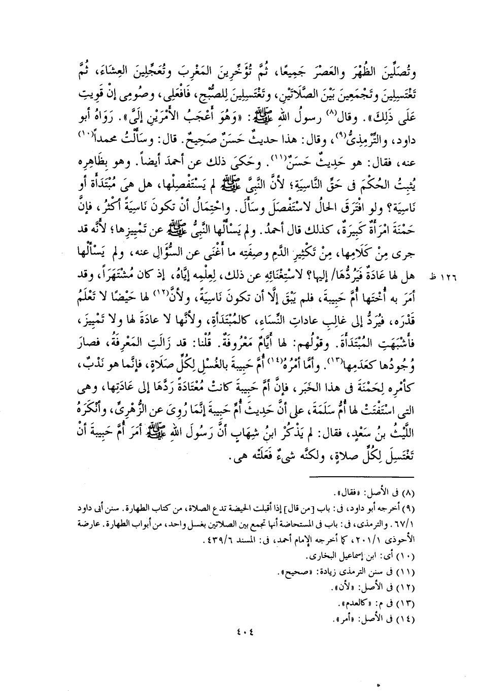 وتُصَلِّينَ الظُهْرَ والعَصْرَ جَمِيعًا، ثُمَّ تُؤَخِّرِينَ المَغْرِبَ وتُعَجِّلِينَ العِشَاءَ، ثُمَّ تَغْتَسِلِينَ وتَجْمَعِينَ بَيْنَ الصَّلَاتَيْنِ، وتَغْتَسِلِينَ لِلصُّبْحِ، فَافْعَلِى، وصُومِى إنْ قَوِيتِ عَلَى ذَلِكَ". وقال (٨) رسولُ اللهِ -صلى اللَّه عليه وسلم-: "وَهُوَ أَعْجَبُ الأَمْرَيْنِ إلَىَّ". رَوَاهُ أبو داود، والتِّرْمِذِىُّ (٩)، وقال: هذا حديثٌ حَسَنٌ صَحِيحٌ. قال: وسَأَلْتُ محمدًا (١٠) عنه، فقال: هو حَدِيثٌ حَسَنٌ (١١). وحَكىَ ذلك عن أحمدَ أيضًا. وهو بِظَاهِرِه يُثبِتُ الحُكْمَ في حَقِّ النَّاسِيَةِ؛ لأنَّ النَّبِىَّ -صلى اللَّه عليه وسلم- لم يَسْتَفْصِلْها، هل هىَ مُبْتَدَأَة أو نَاسِيَة؟ ولو افْتَرَقَ الحالُ لاسْتَفْصَلَ وسَأَلَ. واحْتِمَالُ أنْ تكونَ نَاسِيَةً أكْثرُ، فإنَّ حَمْنَةَ امْرَأَةٌ كَبِيرَةٌ، كذلك قال أحمدُ. ولم يَسْأَلْها النَّبِىُّ -صلى اللَّه عليه وسلم- عن تَمْيِيزِها؛ لأنَّه قد جرى مِنْ كَلَامِها، مِنْ تَكْثِيرِ الدَّمِ وصِفَتِه ما أَغْنَى عن السُّؤَالِ عنه، ولم يَسْألْها هل لها عَادَةٌ فَيَرُدُّهَا إليها؟ لاسْتِغْنَائِهِ عن ذلك، لِعِلْمِه إيَّاهُ، إذ كان مُشْتَهَرًا، وقد أمَرَ به أُخْتَها أُمَّ حَبِيبةَ، فلم يَبْقَ إلَّا أن تكونَ نَاسِيَةً، ولأنَّ (١٢) لها حَيْضًا لا تَعْلَمُ قَدْرَه، فيُرَدُّ إلى غالِبِ عاداتِ النِّسَاءِ، كالمُبْتَدَأةِ، ولأنَّها لا عادَةَ لها ولا تَمْيِيزَ، فأَشْبَهَتِ المُبْتَدَأَةَ. وقوْلُهم: لها أيَّامٌ مَعْرُوفَةٌ. قُلْنا: قد زَالَتِ المَعْرِفَةُ، فصارَ وُجُودُها كعَدَمِها (١٣). وأمَّا أمْرُهُ (١٤) أُمَّ حَبِيبةَ بالغُسْلِ لِكُلِّ صَلَاةٍ، فإنَّما هو نَدْبٌ، كأمْرِه لِحَمْنَةَ في هذا الخَبَر، فإنَّ أمَّ حَبِيبةَ كانتْ مُعْتَادَةً رَدَّهَا إلى عَادَتِها، وهى التي اسْتَفْتَتْ لها أُمُّ سَلَمَةَ، على أنَّ حَدِيثَ أُمِّ حَبِيبةَ إنَّمَا رُوِىَ عن الزُّهْرِىِّ، وأنْكَرَهُ اللَّيْثُ بنُ سَعْدٍ، فقال: لم يَذْكُرْ ابنُ شِهَابٍ أنَّ رَسُولَ اللهِ -صلى اللَّه عليه وسلم- أمَرَ أُمَّ حَبِيبةَ أنْ تَغْتَسِلَ لِكُلِّ صلاةٍ، ولكنَّه شيءٌ فَعَلَتْه هي.