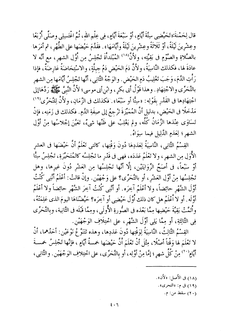 القِسْمُ الثَّانِى، النَّاسِيَةُ لِعَدَدِهَا دُونَ وَقْتِها، كالتى تَعْلَمُ أنَّ حَيْضَها في العشرِ الأُوَلِ مِن الشهرِ، ولا تَعْلَمُ عَدَدَه، فهى في قَدْرِ ما تَجْلِسُه كالمُتَحَيِّرَةِ، تَجْلِسُ سِتًّا أوْ سَبْعًا، في أصَحِّ الرِّوَايَتَيْن، إلَّا أنَّها تَجْلِسُها مِن العَشْرِ دُونَ غيرِها، وهل تَجْلِسُها مِنْ أوَّلِ العَشْرِ، أو بالتَّحَرِّى؟ على وَجْهَيْن. وإنْ قالتْ: أعْلَمُ أنَّنِى كُنْتُ أوَّلَ الشَّهْرِ حائِضًا، ولا أعْلَمُ آخِرَه. أو أنَّنِى كُنْتُ آخِرَ الشَّهْرِ حائِضًا ولا أعْلَمُ أوَّلَه. أو لا أَعْلَمُ هل كان ذلك أوَّلَ حَيْضِى أو آخِرَه؟ حَيَّضْنَاهَا اليومَ الذي عَلِمَتْهُ، وأَتَمَّتْ بَقِيَّةَ حَيْضِها مِمَّا بَعْدَه في الصُّورةِ الأُولَى، ومِمَّا قَبْلَه في الثَّانِية، وبِالتَّحَرِّى فِي الثَّالِثَةِ، أو مِمَّا يَلِى أوَّلَ الشَّهْرِ، على اخْتِلَافِ الوَجْهَيْنِ.
