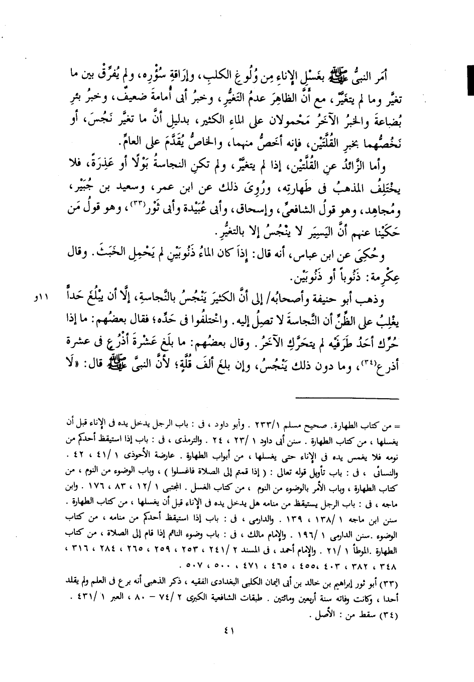 وذهب أبو حنيفة وأصحابُه إلى أنَّ الكثيرَ يَنْجُسُ بالنَّجاسةِ، إلَّا أن يبْلُغَ حَدًّا يغْلِبُ على الظَّنِّ أن النَّجاسةَ لا تصِلُ إليه. واخْتلفُوا في حَدِّه؛ فقال بعضُهم: ما إذا حُرِّك أحَدُ طَرَفَيْه لم يتحَرَّكِ الآخَرُ. وقال بعضُهم: ما بلَغ عَشْرةَ أذْرُعٍ في عشرة أذرع (٣٤)، وما دون ذلك يَنْجُسُ، وإن بلغَ ألفَ قُلَّةٍ؛ لأنَّ النبيَّ -صلى اللَّه عليه وسلم- قال: "لَا