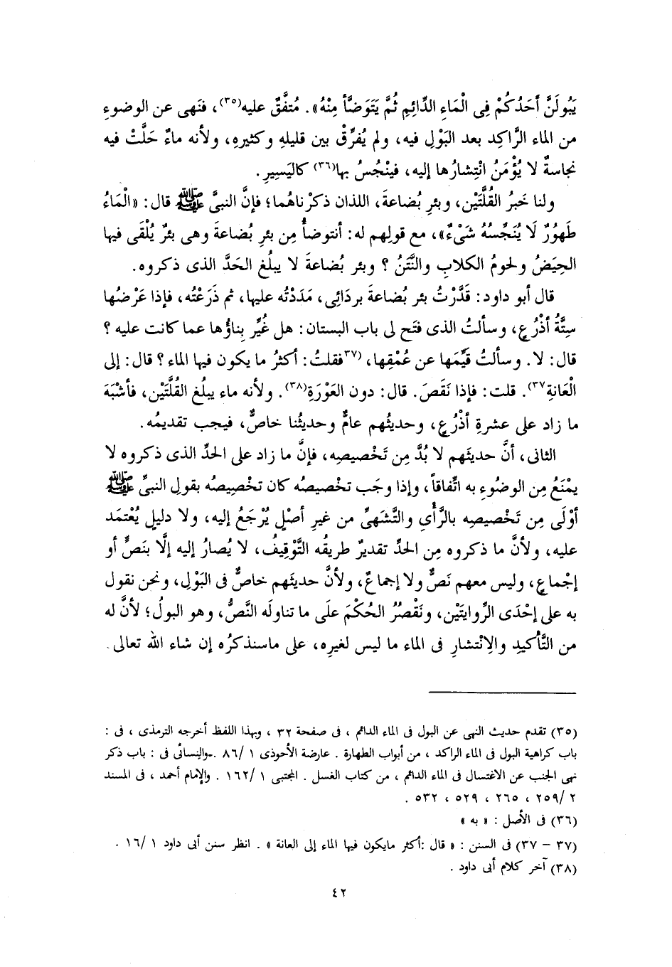 الثانى، أنَّ حديثَهم لا بُدَّ مِن تَخْصيصِه، فإنَّ ما زاد على الحدِّ الذي ذكروه لا يمْنَعُ مِن الوضُوءِ به اتِّفاقًا، وإذا وجَب تخْصيصُه كان تخْصِيصُه بقولِ النبيِّ -صلى اللَّه عليه وسلم- أوْلَى مِن تَخْصيصِه بالرَّأْىِ والتَّشَهىِّ من غيرِ أصْلٍ يُرْجَعُ إليه، ولا دليلٍ يُعْتمَد عليه، ولأنَّ ما ذكروه مِن الحدِّ تقديرٌ طريقُه التَّوْقِيفُ، لا يُصارُ إليه إلَّا بنَصٍّ أو إجْماعٍ، وليس معهم نَصٌّ ولا إجماعٌ، ولأنَّ حديثَهم خاصٌّ في البَوْلِ، ونحن نقول به على إحْدَى الرِّوايتَيْن، ونَقْصُرُ الحُكْمَ علَى ما تناولَه النَّصُّ، وهو البولُ؛ لأنَّ له من التَّأْكيد والِانْتشارِ في الماء ما ليس لغيرِه، على ما سنذكرُه إن شاء اللَّه تعالى.