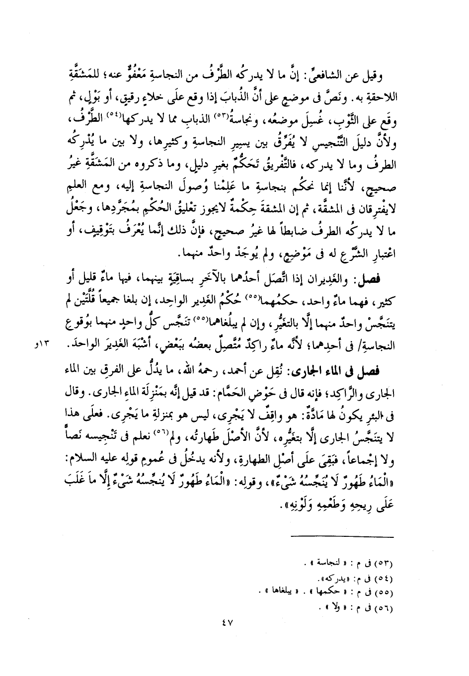 وقيل عن الشافعىِّ: إنَّ ما لا يدركُه الطَّرْفُ من النجاسةِ مَعْفُوٌّ عنه؛ للمشقَّةِ اللاحقةِ به. ونَصَّ في موضع على أنَّ الذُبابَ إذا وقع علَى خلاءٍ رقيقٍ، أو بَوْلٍ، ثم وقَع على الثَّوْبِ، غُسِلَ موضعُه، ونجاسةُ (٥٣) الذبابِ مما لا يدركها (٥٤) الطَّرْفُ، ولأنَّ دليلَ التَّنْجيسِ لا يُفَرِّقُ بين يسِيرِ النجاسةِ وكثيرِها، ولا بين ما يُدْرِكُه الطرفُ وما لا يدركه، فالتَّفْريقُ تَحَكُّمٌ بغيرِ دليلٍ، وما ذكروه من المَشَقَّةِ غيرُ صحيحٍ، لأنَّنا إنما نحكُم بنجاسةِ ما عَلِمْنا وُصولَ النجاسةِ إليه، ومع العلمِ لا يفْترِقان في المشقَّة، ثم إن المشقةَ حِكْمةٌ لا يجوز تعْليقُ الحُكْمِ بمُجَرَّدِها، وجَعْلُ ما لا يدركُه الطرفُ ضابطًا لها غيرُ صحيحٍ، فإنَّ ذلك إنَّما يُعْرَفُ بتَوْقِيفٍ، أو اعْتبارِ الشَّرْعِ له في مَوْضِعٍ، ولم يُوجَدْ واحدٌ منهما.