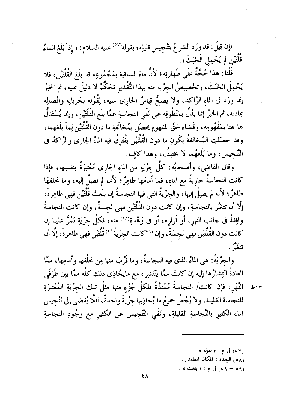 قُلْنا: هذا حُجَّةٌ علَى طَهارتِه؛ لأنَّ ماءَ الساقية بمَجْمُوعِه قد بلَغ القُلَّتَيْن، فلا يَحْمِلُ الخَبَثَ، وتخْصِيصُ الجِرْية منه بهذا التقْديرِ تحَكُّمٌ لا دليلَ عليه، ثم الخبرُ إنما ورَد في الماءِ الرَّاكد، ولا يصحُّ قِياسُ الجارِى عليه، لِقُوَّتِه بجَريانِه واتِّصالِه بمادته، ثم الخبرُ إنما يدُلُّ بمَنْطُوقِه على نَفْىِ النجاسةِ عمَّا بلَغ القُلَّتَيْن، وإنما يُسْتَدلُّ ها هنا بمَفْهُومِه، وقَضاء حَقِّ المفهومِ يحصُل بمُخالَفةِ ما دون القُلَّتَيْن لِمَا بلَغهما، وقد حصَلتِ المُخالفةُ بكَونِ ما دون القُلَّتَيْن يفْتَرِقُ فيه الماءُ الجارى والرَّاكدُ في التَّنْجِيس، وما بَلَغهُما لا يختلِفُ، وهذا كافٍ.