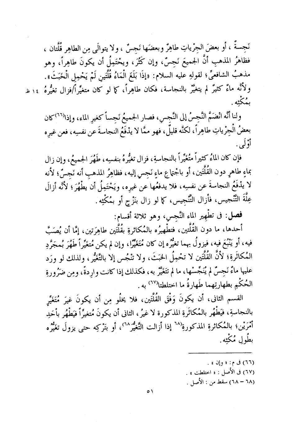 أحدها، ما دون القُلَّتين، فتطْهيرُه بالمُكاثرةِ بقُلَّتَين طاهِرَتين، إمَّا أن يُصَبَّ فيه، أو يَنْبُعَ فيه، فيزولُ بهما تغيُّرُه إن كان مُتَغَيِّرًا، وإن لم يكن مُتغَيِّرًا طَهُرَ بُمجَرَّدِ المُكاثَرةِ؛ لأنَّ القُلَّتَين لا تحْمِلُ الخبَثَ، ولا تنْجُس إلا بالتَّغَيُّر، ولذلك لو ورَد عليها ماءٌ نَجِسٌ لم يُنَجِّسْها، ما لم تتَغَيَّرْ به، فكذلك إذا كانت وارِدةً، ومِن ضَرُورةِ الحُكْمِ بطهارتِهما طَهارةُ ما اختلطتا (٦٧) به.