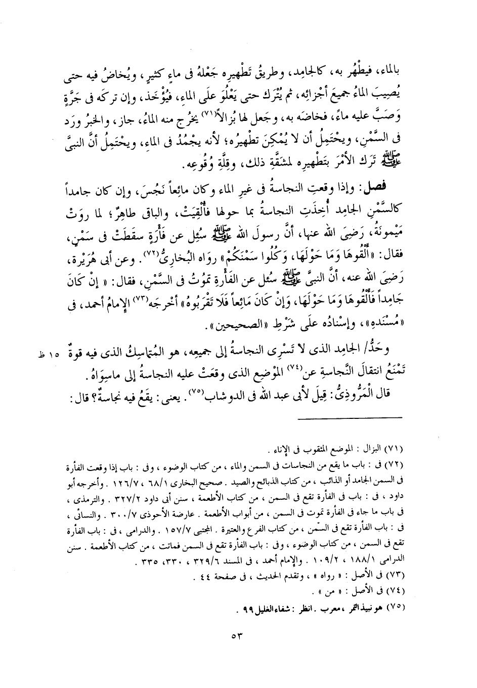 وحَدُّ الجامِد الذي لا تَسْرِى النجاسةُ إلى جميعِه، هو المُتماسِكُ الذي فيه قوةٌ تَمْنَعُ انتقالَ النَّجاسةِ عن (٧٤) الموْضِع الذي وقعَتْ عليه النجاسةُ إلى ما سِواهُ.