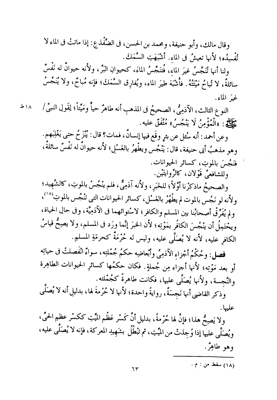 والصحيحُ ما ذكرْنا أوَّلًا؛ للخَبَرِ، ولأنه آدَمِيٌّ، فلم ينْجُسْ بالموتِ، كالشَّهِيد؛ ولأنه لو نَجُس بالموت لم يطْهُرْ بالغَسْل، كسائر الحيوانات التي تنْجُس بالموتِ (١٨)، ولم يُفَرِّقْ أصحابُنا بين المسلم والكافر؛ لاسْتوائهما في الآدَمِيَّة، وفي حالِ الحياة، ويحْتَمِلُ أن ينْجُسَ الكافرُ بمَوْتِه؛ لأن الخبرَ إنَّما ورد في المسلم، ولا يصِحُّ قياسُ الكافرِ عليه، لأنه لا يُصَلَّى عليه، وليس له حُرْمَةٌ كحرمَةِ المسلمِ.