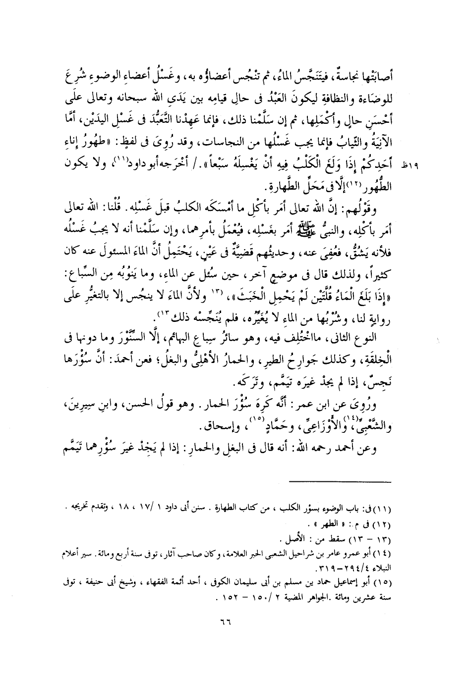 وقَوْلُهم: إنَّ اللَّه تعالى أمَر بأكْلِ ما أمْسَكَه الكلبُ قبلَ غَسْلِه. قُلْنا: اللَّه تعالى أمَر بأكْلِه، والنبىُّ -صلى اللَّه عليه وسلم- أمَر بغَسْلِه، فيُعْمَلُ بأمرِهما، وإن سَلَّمْنا أنه لا يجبُ غَسْلُه فلأنه يَشُقُّ، فعُفِىَ عنه، وحديثُهم قَضِيَّةٌ في عَيْنٍ، يَحْتَمِلُ أنَّ الماءَ المسئولَ عنه كان كثيرًا، ولذلك قال في موضعٍ آخر، حين سُئل عن الماءِ، وما يَنُوبُه مِن السِّباع: "إِذَا بَلَغَ الْمَاءُ قُلَّتَيْن لَمْ يَحْمِلِ الْخَبَثَ"، [ولأنَّ الماءَ لا ينجُس إلا بالتغيُّرِ علَى روايةٍ لنا، وشُرْبُها من الماءِ لا يُغَيِّرُه، فلم يُنَجِّسْه ذلك] (١٣).