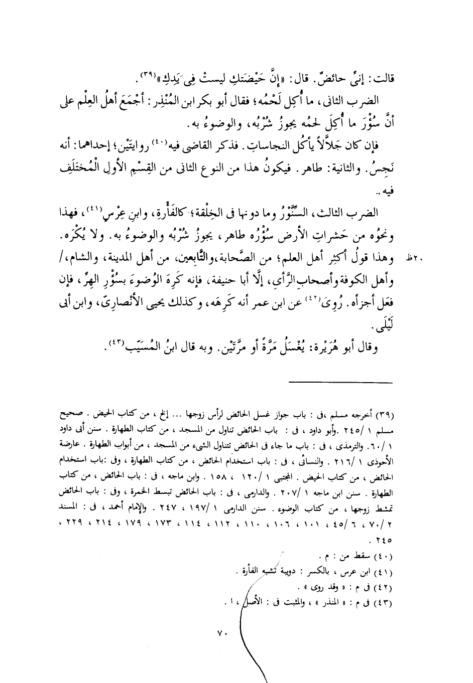 الضرب الثالث، السِّنَّوْرُ وما دونها في الخِلْقة؛ كالفَأْرةِ، وابنِ عِرْسٍ (٤١)، فهذا ونحوُه من حَشراتِ الأرض سُؤْرُه طاهر، يجوزُ شُرْبُه والوضوءُ به. ولا يُكْرَه. وهذا قولُ أكثِر أهل العلم؛ من الصَّحابة، والتَّابِعين، من أهل المدينة، والشام، وأهل الكوفة وأصحابِ الرَّأىِ، إلَّا أبا حنيفة، فإنه كَرِهَ الوُضوءَ بسُؤْرِ الهِرِّ، فإن فعَل أجزأه. رُوِىَ (٤٢) عن ابن عمر أنه كَرِهَه، وكذلك يحيى الأنْصارِىّ، وابن أبي لَيْلَى.