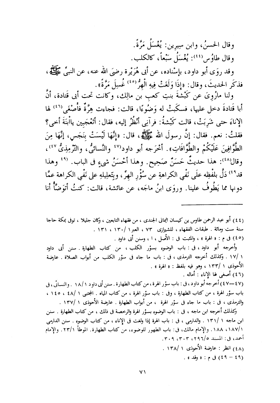 (٤٧) أخرجه أبو داود، في: باب سؤر الهرة، من كتاب الطهارة. سنن أبي داود ١/ ١٨. والنسائي، في باب سؤر الهرة، من كتاب الطهارة، وفى: باب سؤر الهرة، من كتاب المياه. المجتبى ١/ ٤٨، ١٤٥، والترمذي, في: باب ما جاء في سؤر الهرة، من أبواب الطهارة. عارضة الأحوذى ١/ ١٣٧.