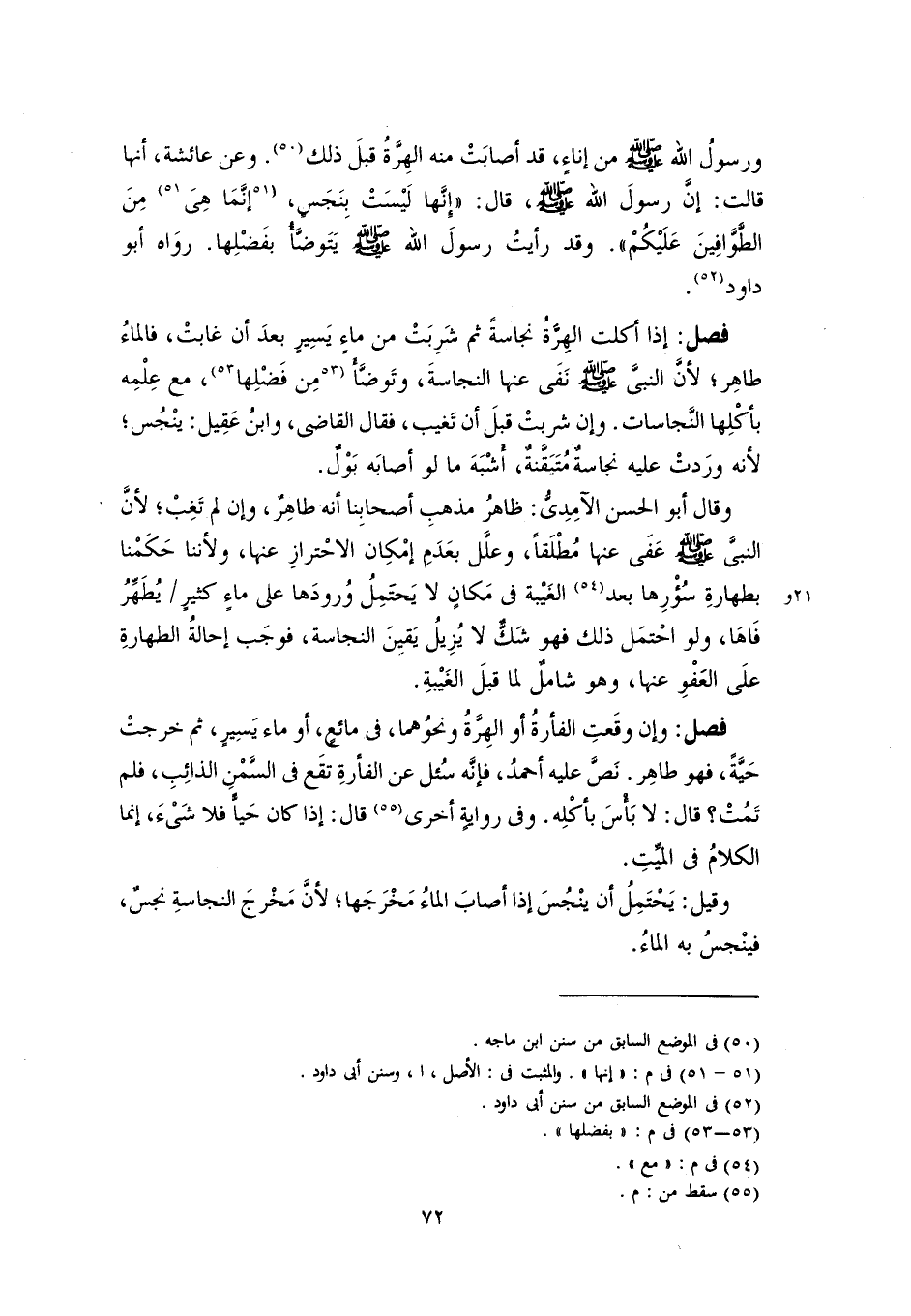 ورسولُ اللَّه -صلى اللَّه عليه وسلم- من إناءٍ، قد أصابَتْ منه الهِرَّةُ قبلَ ذلكِ (٥٠). وعن عائشة، أنها قالت: إنَّ رسولَ اللَّه -صلى اللَّه عليه وسلم-، قال: "إنَّها لَيْسَتْ بنَجَسٍ، [إنَّمَا هِىَ] (٥١) مِنَ الطَّوَّافِينَ عَلَيْكُمْ". وقد رأيتُ رسولَ اللَّه -صلى اللَّه عليه وسلم- يَتَوضَّأُ بفَضْلِها. روَاه أبو داود (٥٢).