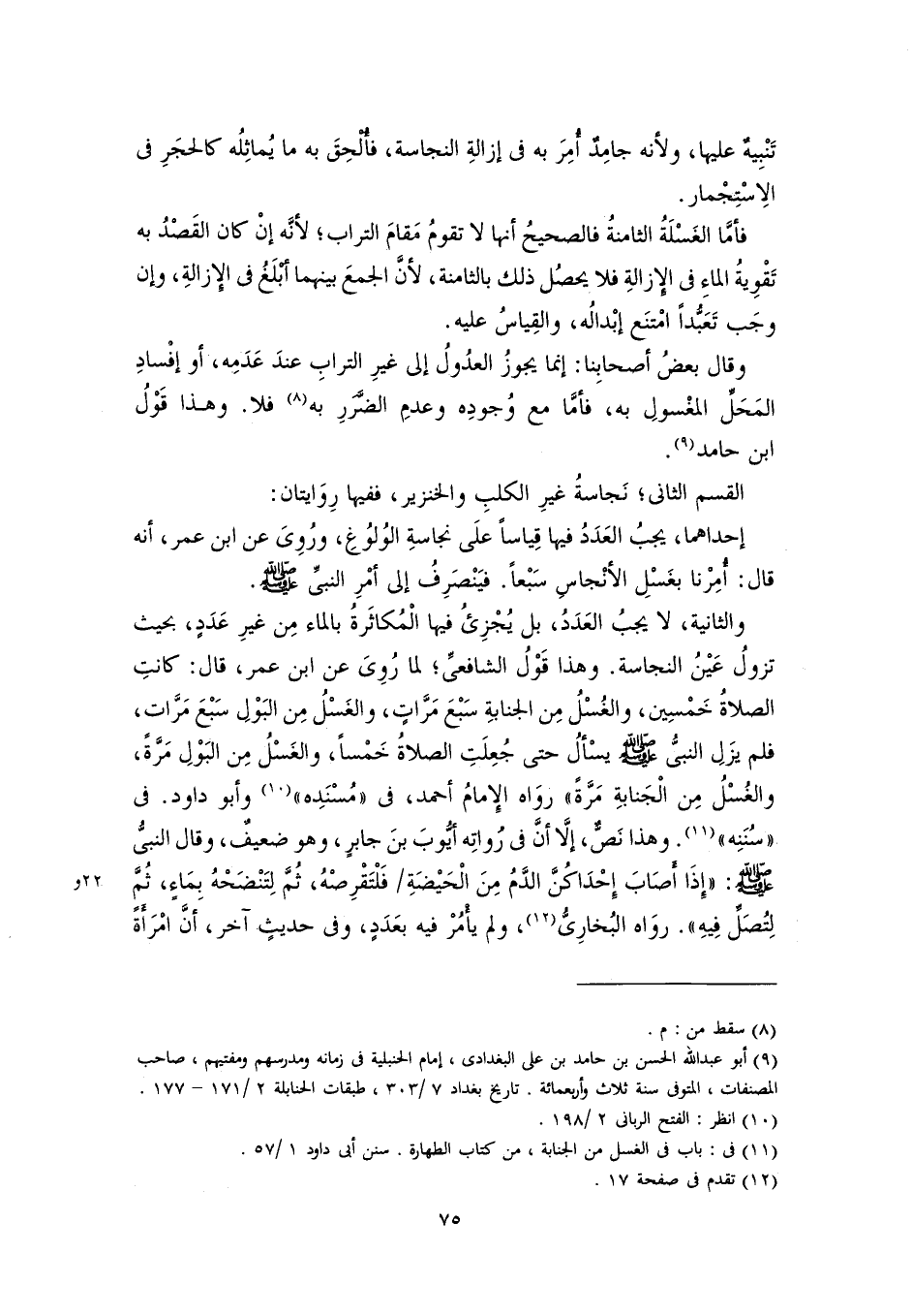 وقال بعضُ أصحابِنا: إنما يجوزُ العدُولُ إلى غيرِ الترابِ عندَ عَدَمِه، أو إفْسادِ المَحَلِّ المغْسولِ به، فأمَّا مع وُجودِه وعدمِ الضَّرَرِ به (٨) فلا. وهذا قَوْلُ ابن حامد (٩).