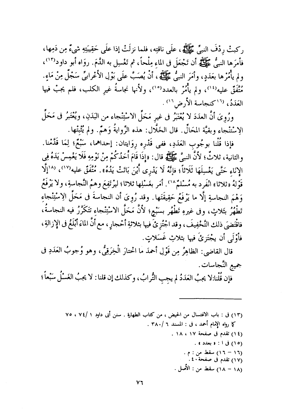 ركبتْ رِدْفَ النبيِّ -صلى اللَّه عليه وسلم-، علَى ناقتِه، فلما نزلَتْ إذا علَى حَقِيبَتِهِ شيءٌ مِن دَمِها، فأمرَها النبيُّ -صلى اللَّه عليه وسلم- أن تَجْعَلَ في الماء مِلْحًا، ثم تَغْسِل به الدَّمَ. روَاه أبو داود (١٣)، ولم يأْمُرْها بعَدَدٍ، وأمَرَ النبيُّ -صلى اللَّه عليه وسلم-، أنْ يُصَبَّ علَى بَوْلِ الأعْرابىِّ سَجْلٌ مِنْ مَاءٍ. مُتَّفَقٌ عليه (١٤)، ولم يأْمُرْ بالعدد (١٥)، ولأنها نجاسةُ غيرِ الكلب، فلم يجبْ فيها العَدَدُ، [كنجاسة الأرضِ] (١٦).
