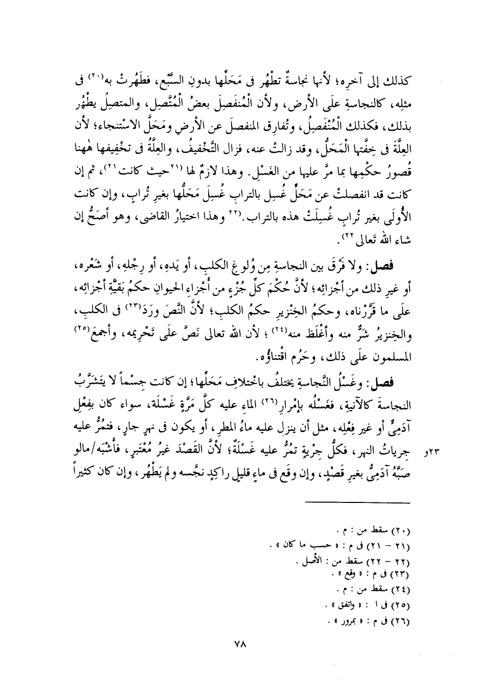 فصل: وغَسْلُ النَّجاسةِ يختلفُ باخْتلافِ مَحَلِّها؛ إن كانت جِسْمًا لا يتَشَرَّبُ النجاسةَ كالآنيةِ، فغَسْلُه بإمْرارِ (٢٦) الماءِ عليه كلَّ مَرَّةٍ غَسْلَة، سواء كان بفِعْلِ آدَمِىٍّ أو غير فِعْلِه، مثل أن ينزل عليه ماءُ المطرِ، أو يكون في نهرٍ جارٍ، فتمُرُّ عليه جِرياتُ النهر، فكلُّ جِرْيةٍ تمُرُّ عليه غَسْلَةٌ؛ لأنَّ القَصْدَ غيرُ مُعْتَبرٍ، فأَشْبَه ما لو صَبَّهُ آدَمِىُّ بغيرِ قَصْدٍ، وإن وقَع في ماءٍ قليلٍ راكِدٍ نجَّسه ولم يَطْهُر، وإن كان كثيرًا