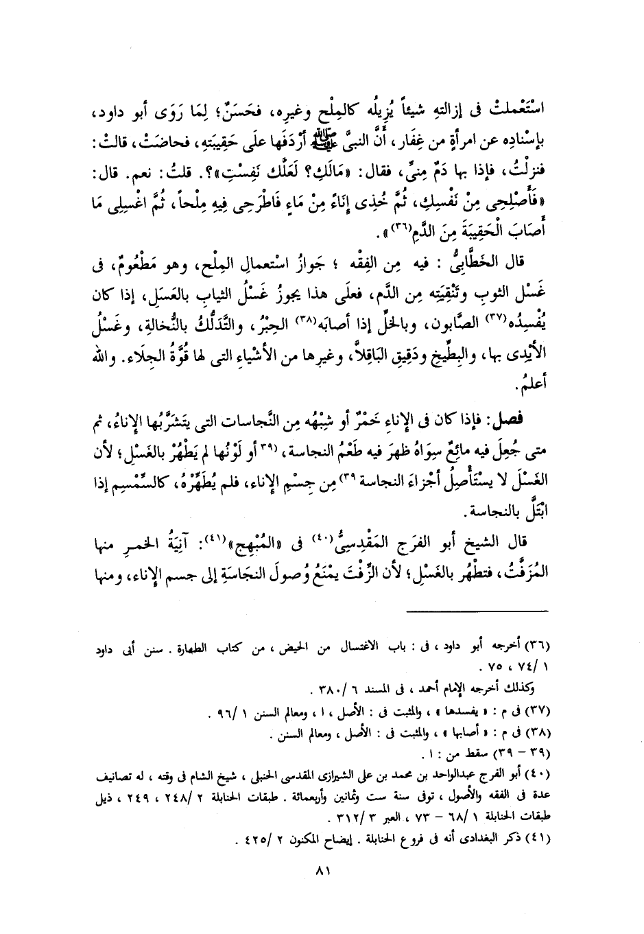 (٣٦) أخرجه أبو داود، في: باب الاغتسال من الحيض، من كتاب الطهارة. سنن أبي داود ١/ ٧٤، ٧٥.