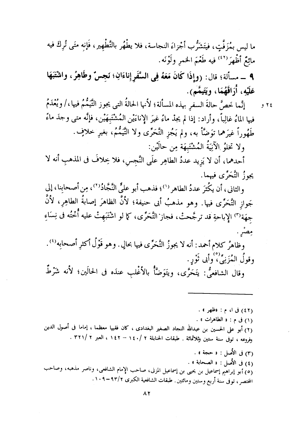 ٩ - مسألة؛ قال: (وِإذَا كَانَ مَعَهُ فِي السَّفَرِ إِناءَانِ؛ نَجِسٌ وطَاهِرُ، واشْتَبَهَا عَلَيْهِ، أَرَاقَهُمَا، ويَتَيمَّم).