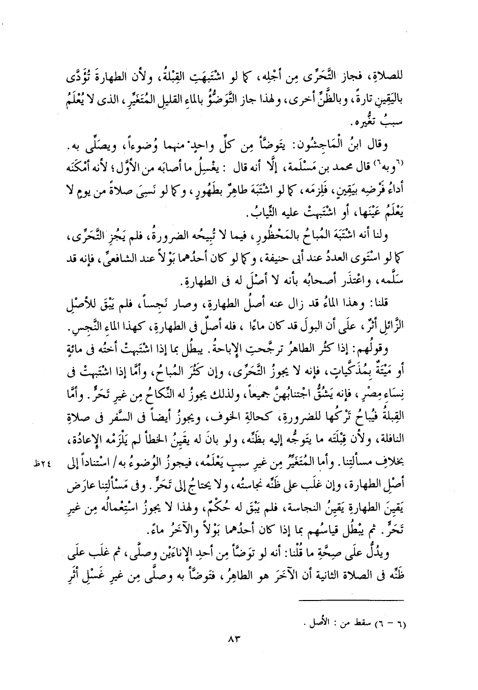 وقولُهم: إذا كثُر الطاهرُ ترجَّحتِ الإِباحةُ. يبطُل بما إذا اشْتَبهتْ أختُه في مائةٍ أو مَيْتَةٌ بِمُذَكَّياتٍ، فإنه لا يجوزُ التَّحَرِّى، وإن كَثُرَ المُباحُ، وأمَّا إذا اشْتَبهتْ في نِسَاءِ مِصْرٍ، فإنه يَشُقُّ اجْتنابُهنَّ جميعًا، ولذلك يجوزُ له النِّكاحُ مِن غيرِ تَحَرٍّ. وأمَّا القِبلةُ فيُباحُ تَرْكُها للضرورةِ، كحالةِ الخوف، ويجوزُ أيضًا في السَّفر في صلاةِ النافلة، ولأن قِبْلَتَه ما يتَوجّه إليه بظَنِّه، ولو بانَ له يَقِينُ الخطأ لم يَلْزَمْه الإِعادةُ، بخلافِ مسألتِنا. وأما المُتَغَيِّرُ مِن غيرِ سببٍ يَعْلَمُه، فيجوزُ الوُضوءُ به اسْتنادًا إلى أصْلِ الطهارة، وإن غلَب على ظَنِّه نجاستُه، ولا يحتاجُ إلى تَحَرٍّ. وفي مَسْألتِنا عارَض يَقيِنَ الطهارةِ يَقِينُ النجاسة، فلم يَبْقَ له حُكْمٌ، ولهذا لا يجوزُ اسْتِعْمالُه مِن غيرِ تَحَرٍّ. ثم يبْطُل قياسُهم بما إذا كان أحدُهما بَوْلًا والآخَرُ ماءً.