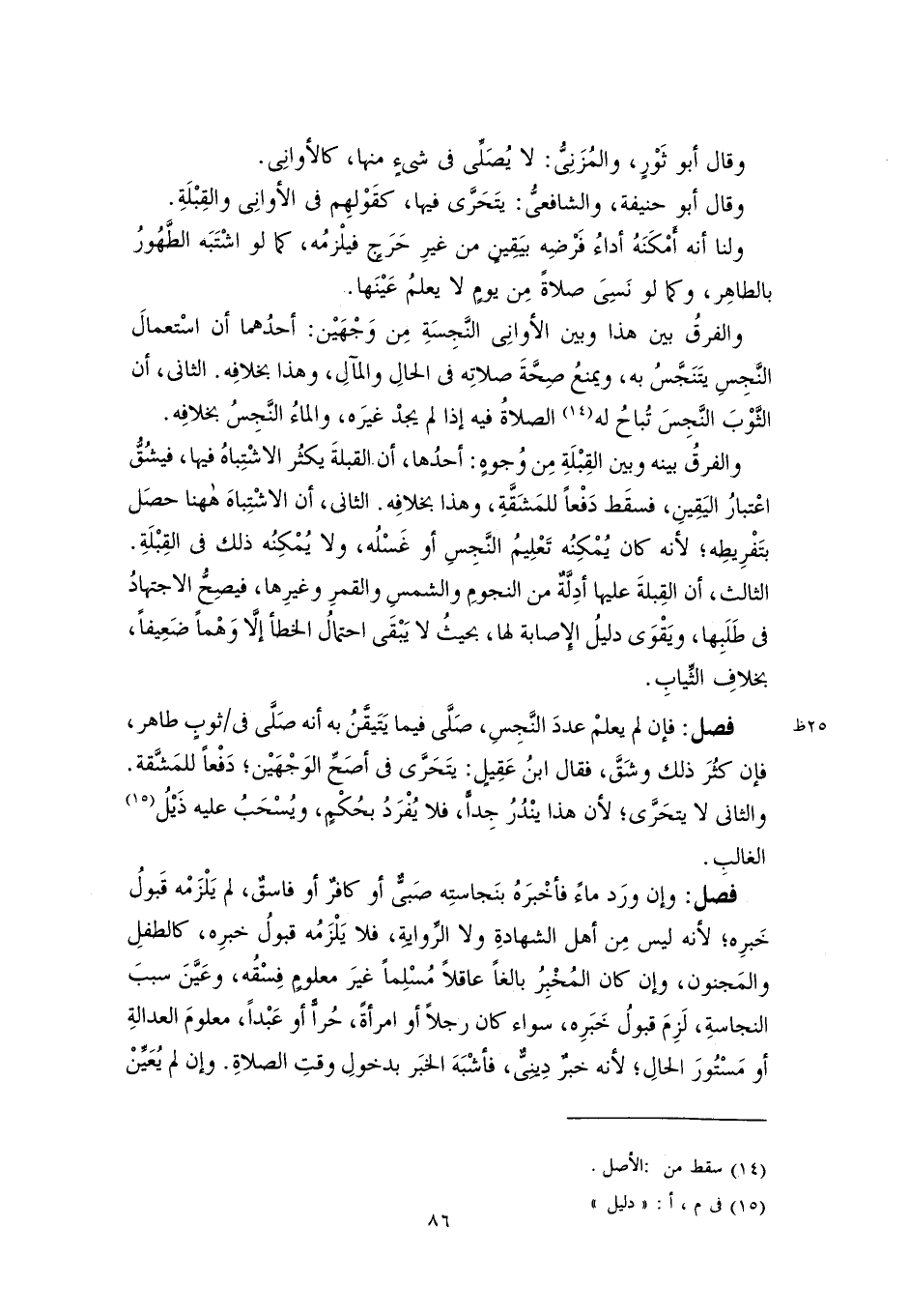 والفرقُ بينه وبين القِبْلَةِ مِن وُجوهٍ: أحدُها، أن القبلةَ يكثُر الاشْتِباهُ فيها، فيشُقُّ اعْتبارُ اليَقِينِ، فسقَط دَفْعًا للمَشَقَّةِ، وهذا بخلافِه. الثاني، أن الاشْتِباهَ ههنا حصَل بتَفْرِيطِه؛ لأنه كان يُمْكِنُه تَعْلِيمُ النَّجِسِ أو غَسْلُه، ولا يُمْكِنُه ذلك في القِبْلَةِ. الثالث، أن القِبلةَ عليها أدِلَّةٌ من النجومِ والشمسِ والقمرِ وغيرِها، فيصِحُّ الاجتهادُ في طَلَبِها، ويَقْوَى دليلُ الإِصابة لها، بحيثُ لا يَبْقَى احتمالُ الخطأ إلَّا وَهْمًا ضَعِيفًا، بخلافِ الثِّيابِ.