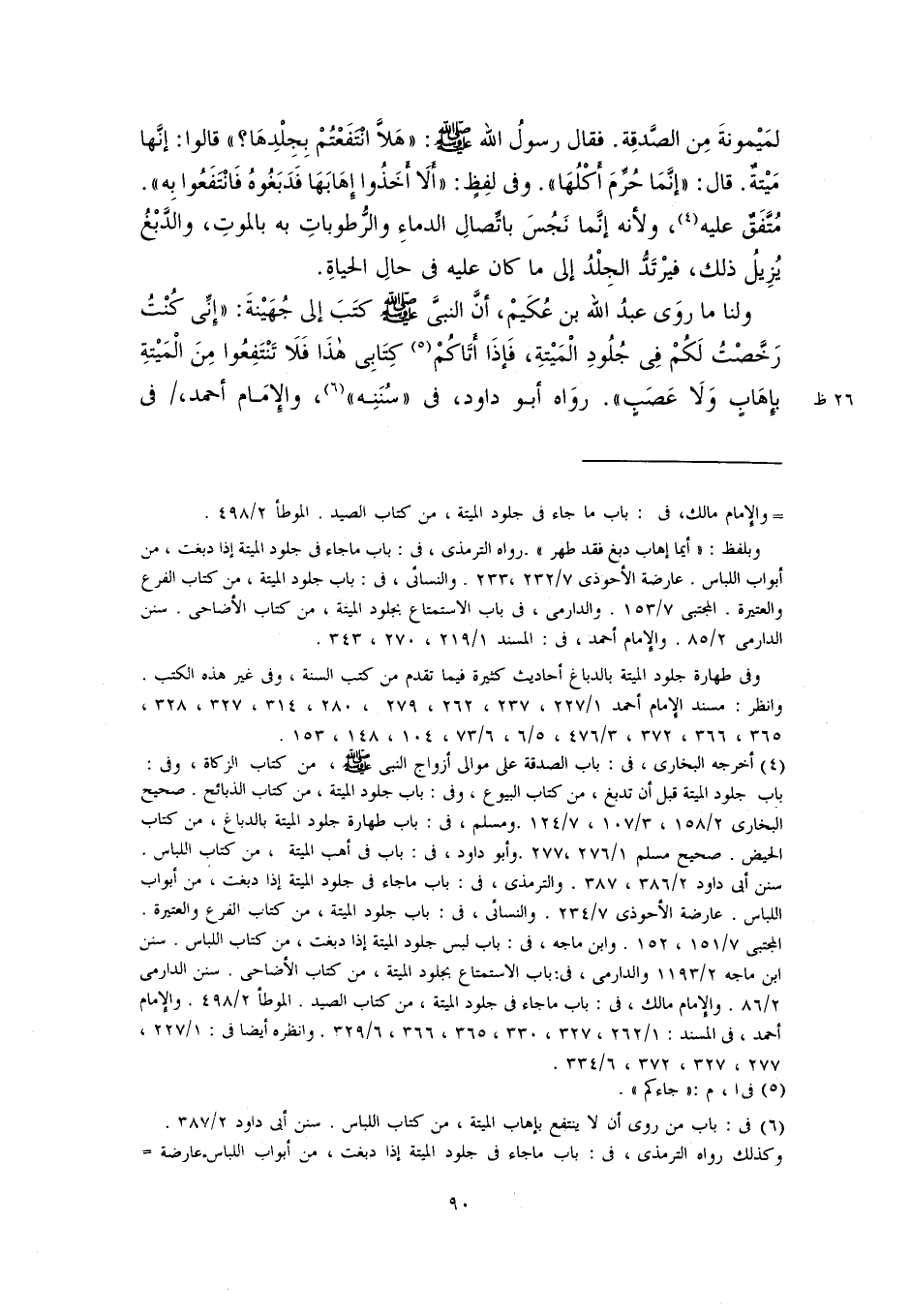 (٤) أخرجه البخاري، في: باب الصدقة على موالى أزواج النبي -صلى اللَّه عليه وسلم-، من كتاب الزكاة، وفى: باب جلود الميتة قبل أن تدبغ، من كتاب البيوع , وفى: باب جلود الميتة، من كتاب الذبائح. صحيح البخاري ٢/ ١٥٨، ٣/ ١٠٧، ٧/ ١٢٤. ومسلم، في: باب طهارة جلود الميتة بالدباغ، من كتاب الحيض. صحيح مسلم ١/ ٢٧٦، ٢٧٧. وأبو داود، في: باب في أهب الميتة، من كتاب اللباس. سنن أبي داود ٢/ ٣٨٦، ٣٨٧. والترمذي، في: باب ما جاء في جلود الميتة إذا دبغت، من أبواب اللباس. عارضة الأحوذى ٧/ ٢٣٤. والنسائي، في: باب جلود الميتة، من كتاب الفرع والعتيرة. المجتبى ٧/ ١٥١، ١٥٢. وابن ماجه، في: باب لبس جلود الميتة إذا دبغت، من كتاب اللباس. سنن ابن ماجه ٢/ ١١٩٣ والدارمى، في: باب الاستمتاع بجلود الميتة، من كتاب الأضاحى. سنن الدارمي ٢/ ٨٦. والإمام مالك، في: باب ما جاء في جلود الميتة، من كتاب الصيد. الموطأ ٢/ ٤٩٨. والإمام أحمد، في المسند: ١/ ٢٦٢، ٣٢٧، ٣٣٠، ٣٦٥، ٣٦٦، ٦/ ٣٢٩. وانظره أيضًا في: ١/ ٢٢٧، ٢٧٧، ٣٢٧، ٣٧٢، ٦/ ٣٣٤.