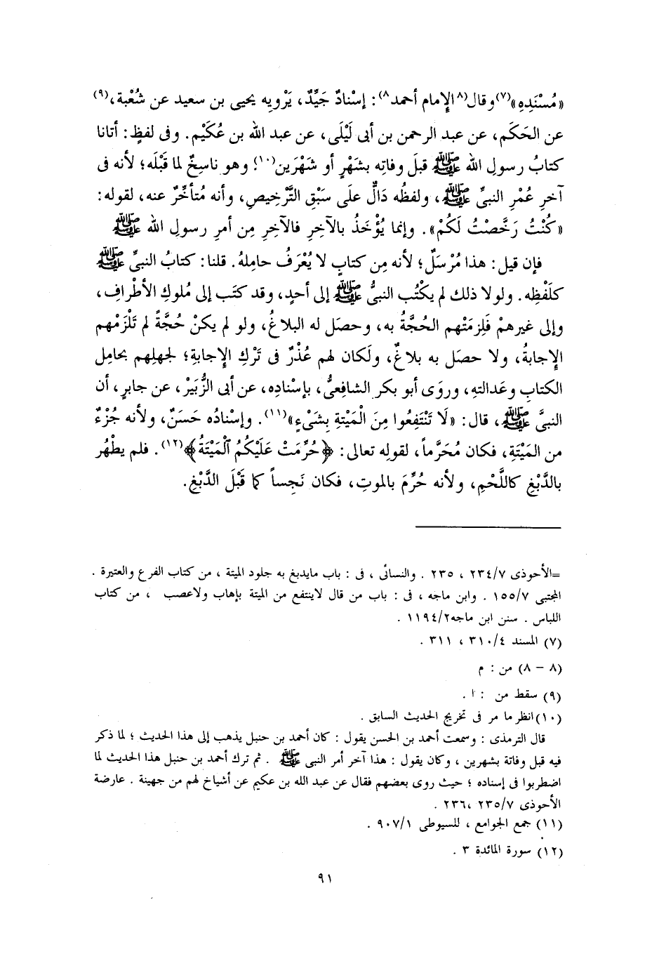 "مُسْنَدِهِ" (٧) وقال [الإمام أحمد] (٨): إسْنادٌ جَيِّدٌ، يَرْوِيه يحيى بن سعيد عن شُعْبة، (٩) عن الحَكَم، عن عبد الرحمن بن أبي لَيْلَى، عن عبد اللَّه بن عُكَيْم. وفى لفظٍ: أتانا كتابُ رسولِ اللَّه -صلى اللَّه عليه وسلم- قبلَ وفاتِه بشَهْرٍ أو شَهْرَين (١٠) وهو ناسِخٌ لما قَبْلَه؛ لأنه في آخرِ عُمْرِ النبيِّ -صلى اللَّه عليه وسلم-، ولفظُه دَالٌّ علَى سَبْقِ التَّرْخِيصِ، وأنه مُتأخِّرٌ عنه، لقوله: "كُنْتُ رَخَّصْتُ لَكُمْ". وإنما يُؤْخَذُ بالآخِرِ فالآخِرِ مِن أمرِ رسولِ اللَّه -صلى اللَّه عليه وسلم-