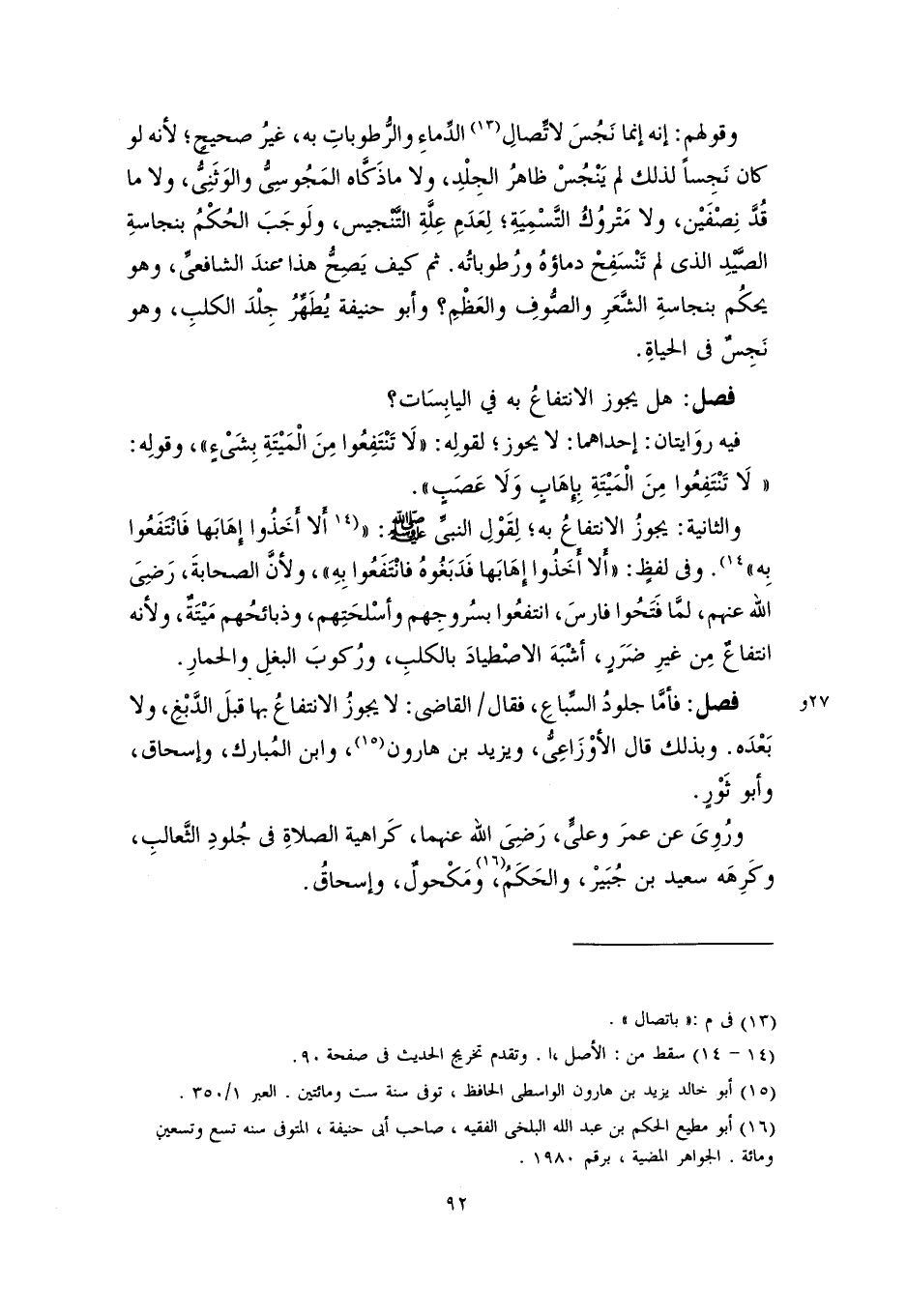 وقولهم: إنه إنما نَجُسَ لاتِّصالِ (١٣) الدِّماءِ والرُّطوباتِ به، غيرُ صحيحٍ؛ لأنه لو كان نَجِسًا لذلك لم يَنْجُسْ ظاهرُ الجِلْدِ، ولا ما ذَكَّاه المَجُوسِىُّ والوَثَنِىُّ، ولا ما قُدَّ نِصْفَيْن، ولا مَتْرُوكُ التَّسْمِيَةِ؛ لِعَدَمِ عِلَّةِ التَّنْجيس، ولَوجَبَ الحُكْمُ بنجاسةِ الصَّيْدِ الذي لم تَنْسَفِحْ دماؤهُ ورُطوباتُه. ثم كيف يَصِحُّ هذا عندَ الشافعيِّ، وهو يحكُم بنجاسةِ الشَّعَرِ والصُّوفِ والعَظْمِ؟ وأبو حنيفة يُطَهِّرُ جِلْدَ الكلبِ، وهو نَجِسٌ في الحياةِ.