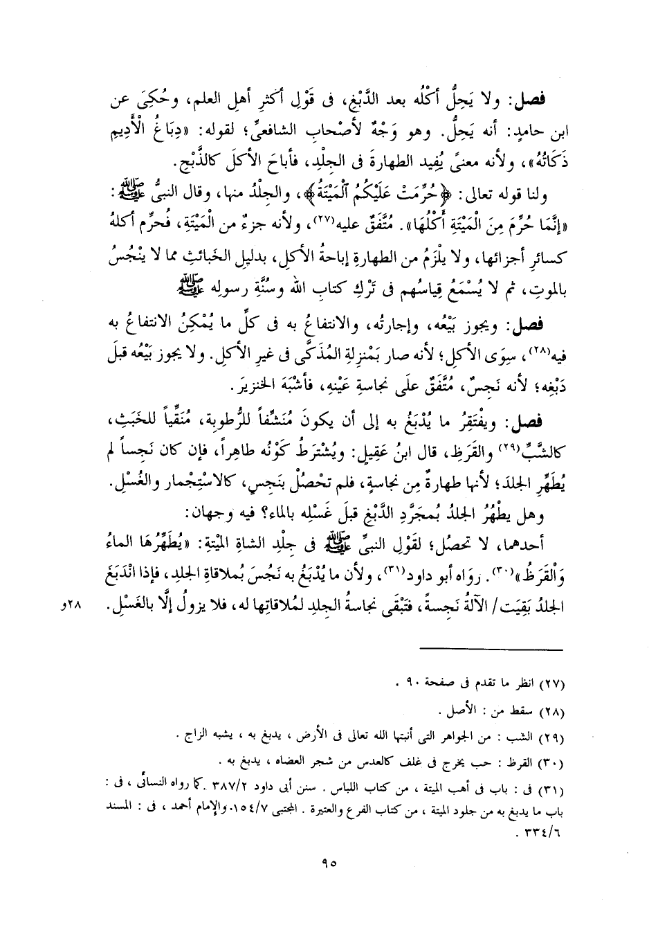 (٣١) في: باب في أهب الميتة، من كتاب اللباس. سنن أبى داود ٢/ ٣٨٧. كما رواه النسائي، في: باب ما يدبغ به من جلود الميتة، من كتاب الفرع والعتيرة. المجتبى ٧/ ١٥٤. والإمام أحمد، في: المسند ٦/ ٣٣٤.