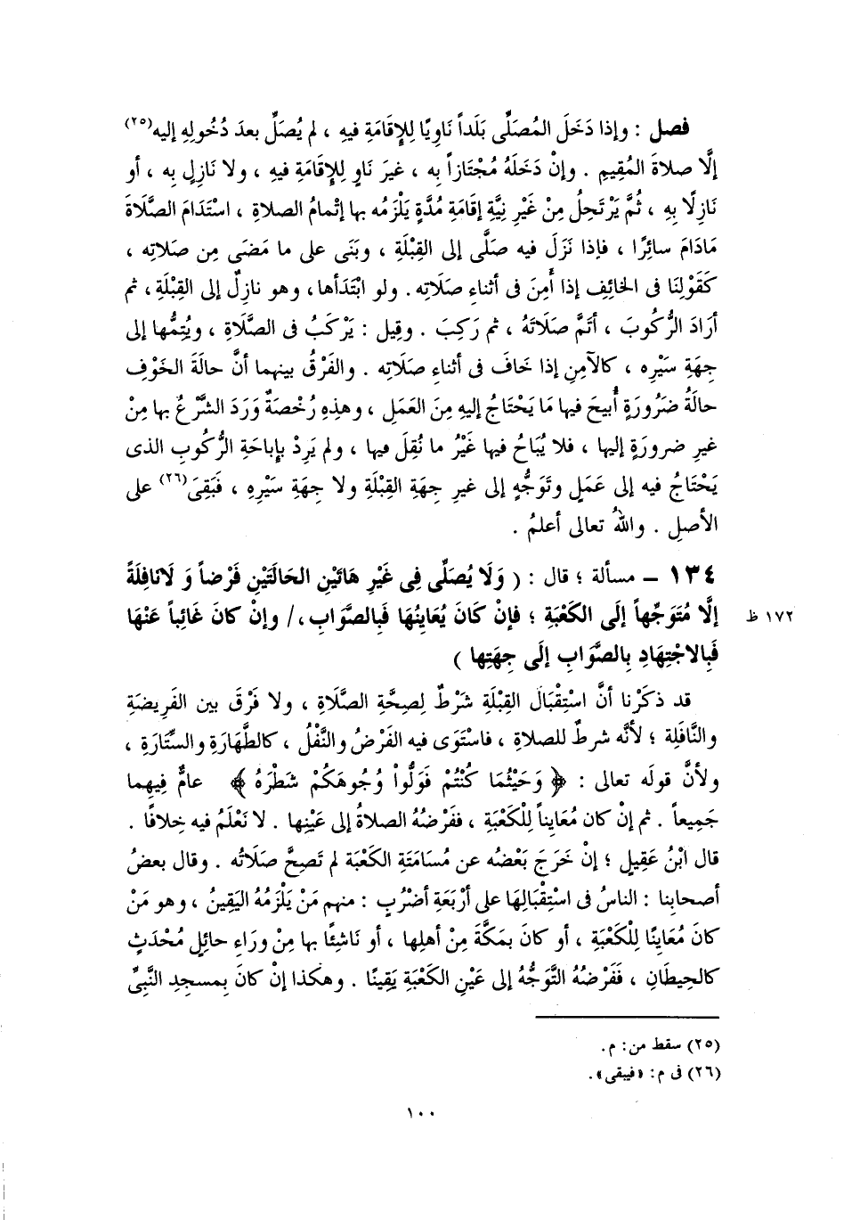 فصل: وإذا دَخَلَ المُصَلِّى بَلَدًا نَاوِيًا لِلإِقَامَةِ فيهِ، لم يُصَلِّ بعدَ دُخُولِهِ إليه (٢٥) إلَّا صلاةَ المُقِيمِ. وإنْ دَخَلَهُ مُجْتَازًا بِه، غيرَ نَاوٍ لِلإِقَامَةِ فيهِ، ولا نَازِلٍ بِه، أو نَازِلًا بِهِ، ثُمَّ يَرْتَحِلُ مِنْ غَيْرِ نِيَّةِ إقَامَةِ مُدَّةٍ يَلْزَمُه بها إتْمامُ الصلاةِ، اسْتَدَامَ الصَّلَاةَ مَا دَامَ سائِرًا، فإذا نَزَلَ فيه صَلَّى إلى القِبْلَةِ، وبَنَى على ما مَضَى مِن صَلاتِه، كَقَوْلِنَا في الخائِفِ إذا أَمِنَ في أثناءِ صَلَاتِه. ولو ابْتَدَأها، وهو نازِلٌ إلى القِبْلَةِ، ثم أرَادَ الرُّكُوبَ، أتَمَّ صَلَاتَهُ، ثم رَكِبَ. وقِيل: يَرْكَبُ في الصَّلَاةِ، ويُتِمُّها إلى جِهَةِ سَيْرِه، كالآمِنِ إذا خَافَ في أثناءِ صَلَاتِه. والفَرْقُ بينهما أنَّ حالَةَ الخَوْفِ حالَةُ ضَرُورَةٍ أُبيحَ فيها مَا يَحْتَاجُ إليهِ مِنَ العَمَلِ، وهذِهِ رُخْصَةٌ وَرَدَ الشَّرْعُ بها مِنْ غيرِ ضرورَةٍ إليها، فلا يُبَاحُ فيها غَيْرُ ما نُقِلَ فيها، ولم يَرِدْ بإِباحَةِ الرُّكُوبِ الذي يَحْتَاجُ فيه إلى عَمَلٍ وتَوَجُّهٍ إلى غيرِ جِهَةِ القِبْلَةِ ولا جِهَةِ سَيْرِهِ، فَبَقِىَ (٢٦) على الأصلِ. واللهُ تعالى أعلمُ.